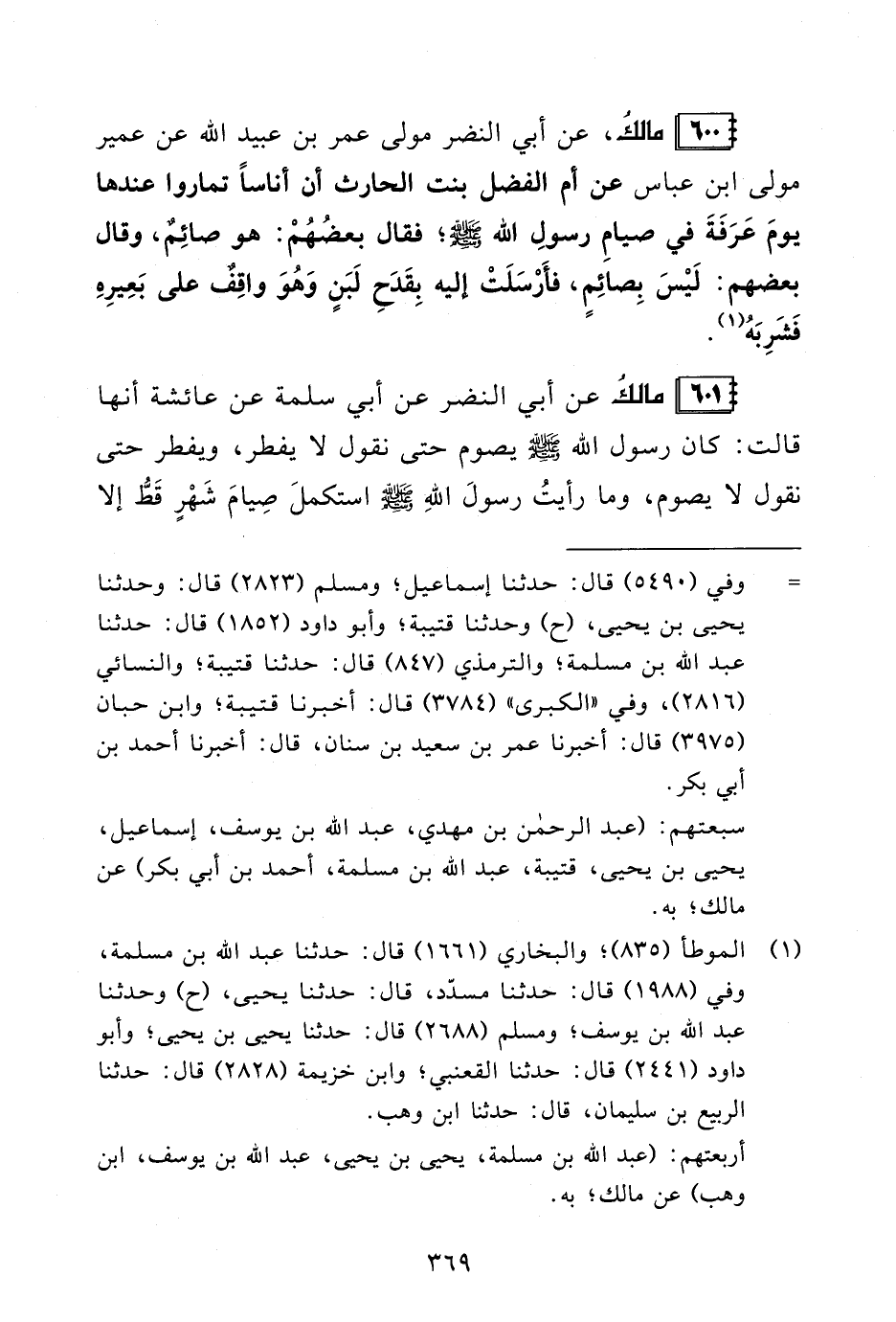 600 - مالكُ، عن أبي النضر مولى عمر بن عبيد الله عن عمير مولى ابن عباس عن أم الفضل بنت الحارث أن أناسًا تماروا عندها يومَ عَرَفَةَ في صيامِ رسولِ الله - صلى الله عليه وسلم -؛ فقال بعضُهُمْ: هو صائِمٌ، وقال بعضهم: لَيْسَ بِصائِمٍ، فأَرْسَلَتْ إليه بِقَدَحِ لَبَنٍ وَهُوَ واقِفٌ على بَعِيرِهِ فَشَرِبَهُ (¬1).