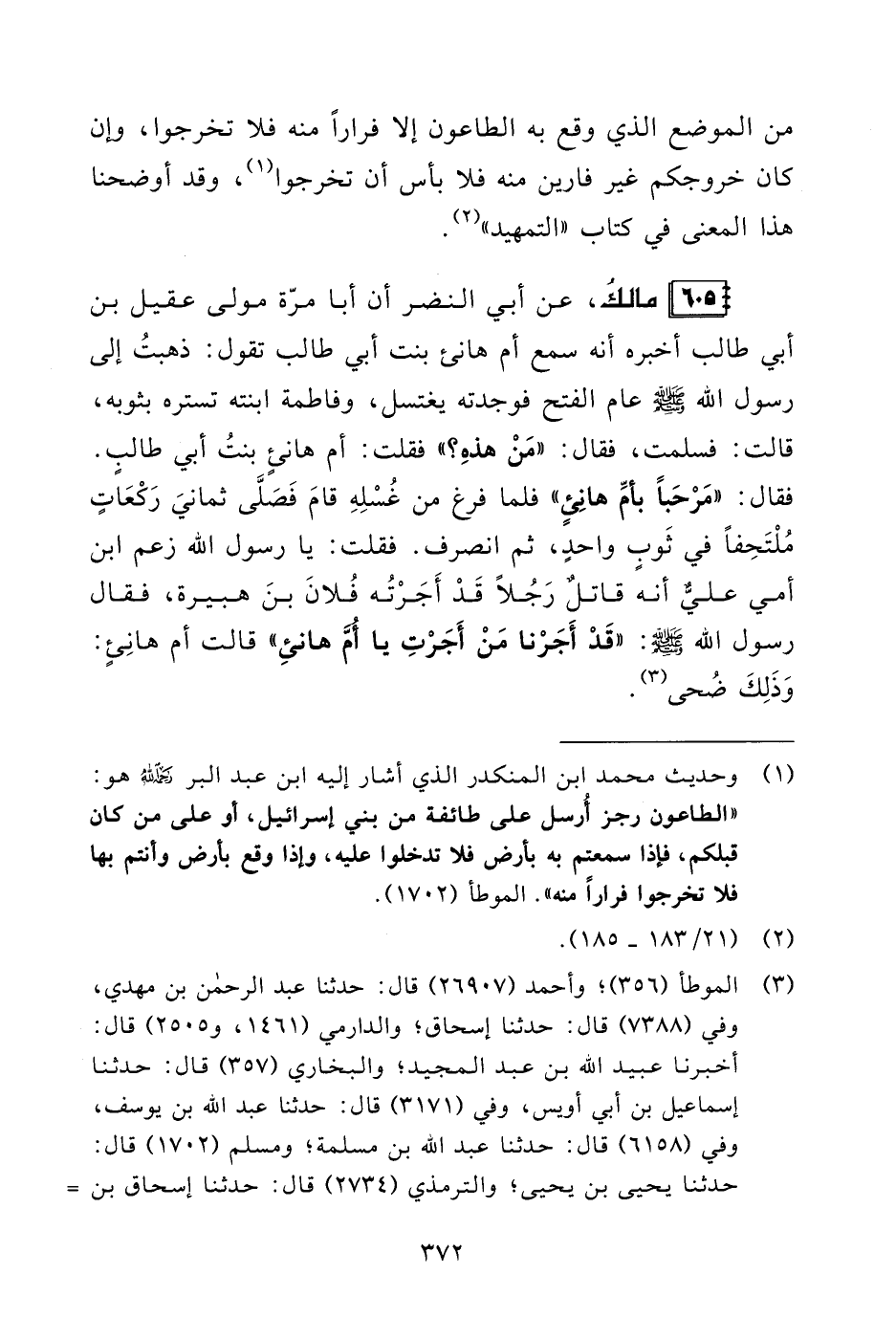 605 - مالكُ، عن أبي النضر أن أبا مرّة مولى عقيل بن أبي طالب أخبره أنه سمع أم هانئ بنت أبي طالب تقول: ذهبتُ إلى رسول الله - صلى الله عليه وسلم - عام الفتح فوجدته يغتسل، وفاطمة ابنته تستره بثوبه، قالت: فسلمت، فقال: "مَنْ هذهِ؟ " فقلت: أم هانئٍ بنتُ أبي طالبٍ. فقال: "مَرْحَبًا بأمِّ هانِئٍ" فلما فرغ من غُسْلِهِ قامَ فَصَلَّى ثمانيَ رَكْعَاَتٍ مُلْتَحِفًا في ثَوبٍ واحدٍ، ثم انصرف. فقلت: يا رسول الله زعم ابن أمي عليٌّ أنهَ قاتلٌ رَجُلًا قَدْ أَجَرْتُه فُلانَ بنَ هبيرة، فقال رسول الله - صلى الله عليه وسلم -: "قَدْ أَجَرْنا مَنْ أَجَرْتِ يا أُمَّ هانئِ" قالت أم هانِئٍ: وَذَلِكَ ضُحى (¬3).