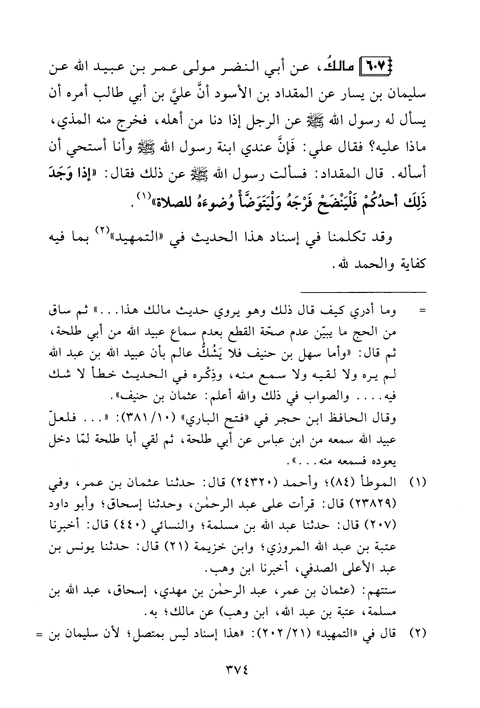 607 - مالكُ، عن أبي النضر مولى عمر بن عبيد الله عن سليمان بن يسار عن المقداد بن الأسود أنَّ عليَّ بن أبي طالب أمره أن يسأل له رسول الله - صلى الله عليه وسلم - عن الرجل إذا دنا من أهله، فخرج منه المذي، ماذا عليه؟ فقال علي: فَإنَّ عندي ابنة رسول الله - صلى الله عليه وسلم - وأنا أستحي أن أسأله. قال المقداد: فسألت رسول الله - صلى الله عليه وسلم - عن ذلك فقال: "إذا وَجَدَ ذَلِكَ أحدُكُمْ فَلْيَنْضَحْ فَرْجَهُ وَلْيَتَوَضَّأْ وُضوءَهُ للصلاة" (¬1).