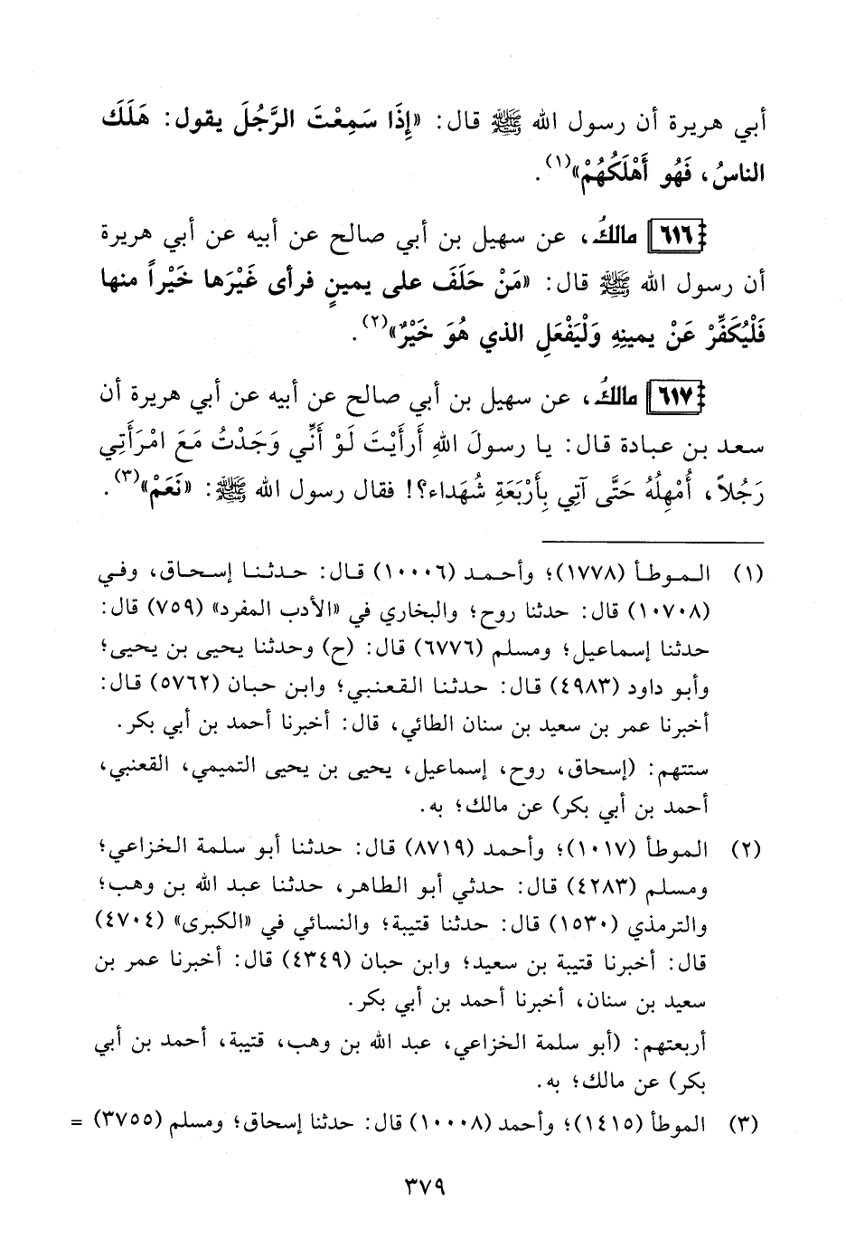617 - مالكُ، عن سهيل بن أبي صالح عن أبيه عن أبي هريرة أن سعد بن عبادة قال: يا رسولَ اللهِ أَرأَيْتَ لَوْ أَنِّي وَجَدْتُ مَعَ امْرَأَتِي رَجُلًا، أُمْهِلُهُ حَتَّى آتِي بِأَرْبَعَةِ شُهَداء؟ ! فقال رسول الله - صلى الله عليه وسلم -: "نَعَمْ" (¬3).