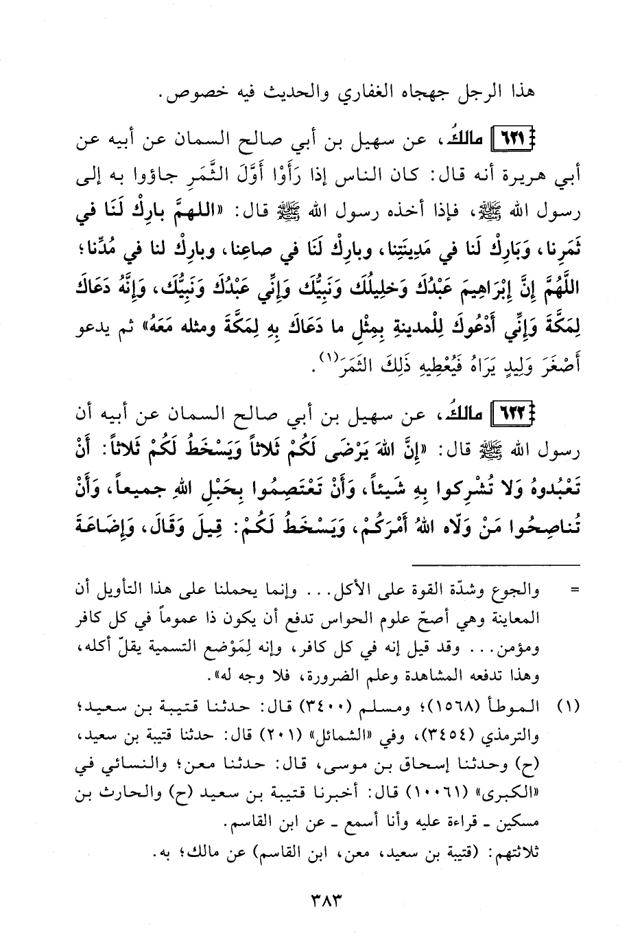 621 - مالكُ، عن سهيل بن أبي صالح السمان عن أبيه عن أبي هريرة أنه قال: كان الناس إذا رَأَوْا أَوَّلَ الثَّمَرِ جاؤوا به إلى رسول الله - صلى الله عليه وسلم -، فإذا أخذه رسول الله - صلى الله عليه وسلم - قال: "اللهمَّ بارِكْ لَنَا في ثَمَرِنا، وَبَارِكْ لَنا في مَدِينَتِنا، وبارِكْ لَنَا في صاعِنا، وبارِكْ لنا في مُدِّنا، اللَّهُمَّ إِنَّ إِبْرَاهِيمَ عَبْدُكَ وَخلِيلُكَ وَنَبِيُّكَ وَإِنِّي عَبْدُكَ وَنَبِيُّكَ، وَإِنَّهُ دَعَاكَ لِمَكَّةَ وَإِنِّي أَدْعُوكَ لِلْمدينةِ بِمِثْلِ ما دَعَاكَ بِهِ لِمَكَّةَ ومثله مَعَهُ" ثم يدعو أَصْغَرَ وَلِيدٍ يَرَاهُ فَيُعْطِيهِ ذَلِكَ الثَمَرَ (¬1).