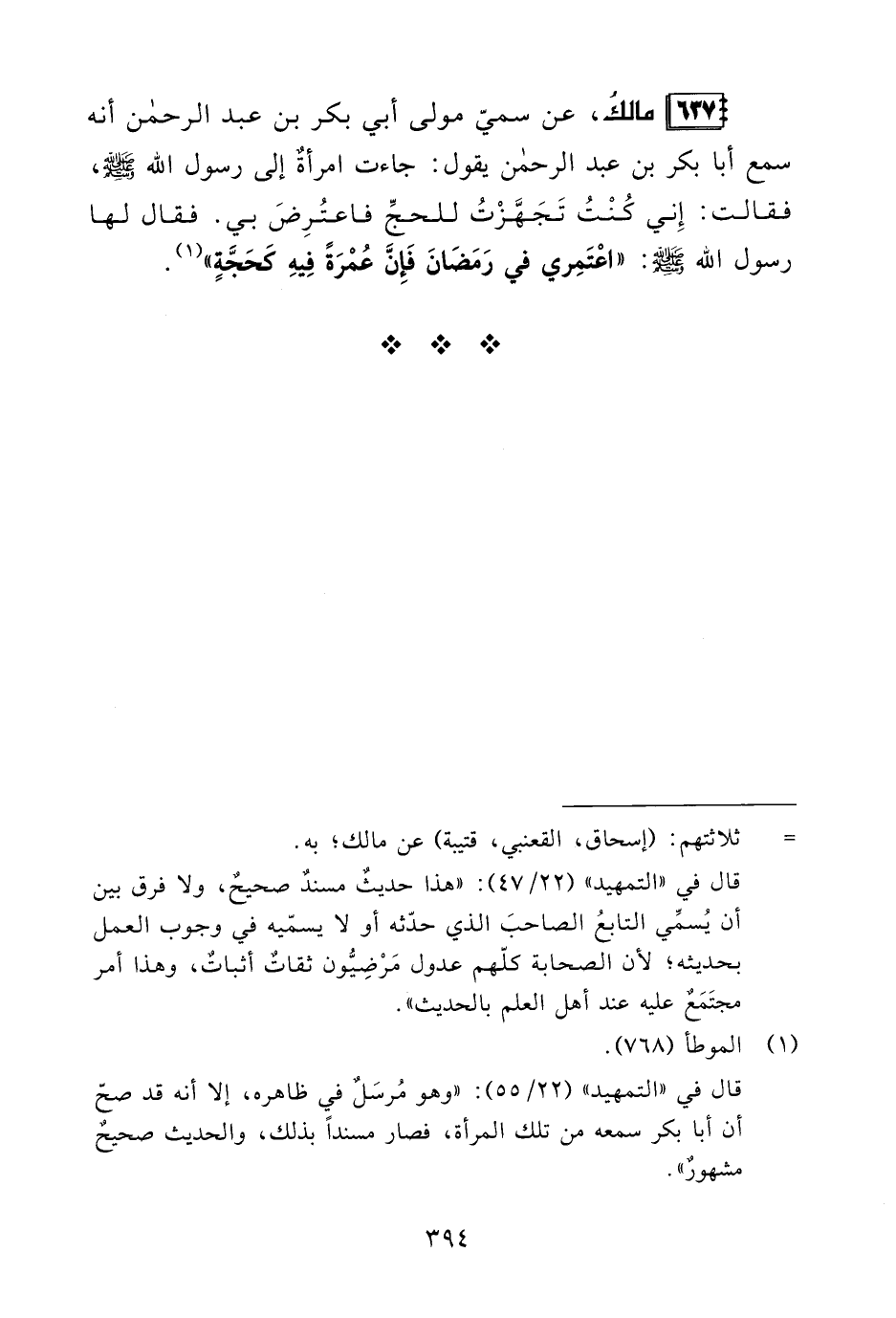 637 - مالكُ، عن سميّ مولى أبي بكر بن عبد الرحمن أنه سمع أبا بكر بن عبد الرحمن يقول: جاءت امرأةٌ إلى رسول الله - صلى الله عليه وسلم -، فقالت: إِني كُنْتُ تَجَهَّزْتُ للحجِّ فاعتُرِضَ بي. فقال لها رسول الله - صلى الله عليه وسلم -: "اعْتَمِري في رَمَضَانَ فَإِنَّ عُمْرَةً فِيهِ كَحَجّةٍ" (¬1).