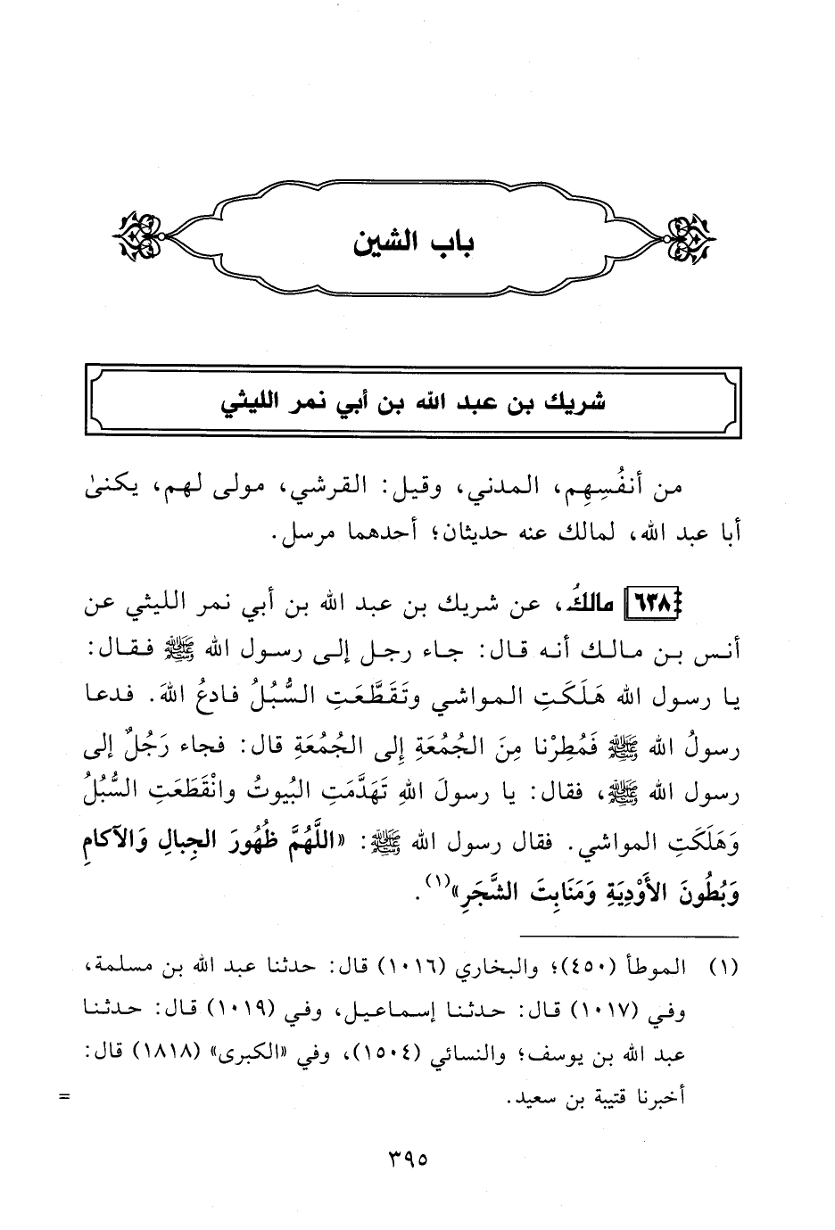 638 - مالكُ، عن شريك بن عبد الله بن أبي نمر الليثي عن أنس بن مالك أنه قال: جاء رجل إلى رسول الله - صلى الله عليه وسلم - فقال: يا رسول الله هَلَكَتِ المواشي وتَقَطِّعَتِ السُّبُلُ فادعُ اللهَ. فدعا رسولُ الله - صلى الله عليه وسلم - فَمُطِرْنا مِنَ الجُمُعَةِ إِلى الجُمُعَةِ قال: فجاء رَجُلٌ إلى رسول الله - صلى الله عليه وسلم -، فقال: يا رسولَ اللهِ تَهَدَّمَتِ البُيوتُ وانْقَطَعَتِ السُّبُلُ وَهَلَكَتِ المواشي. فقال رسول الله - صلى الله عليه وسلم -: "اللَّهُمَّ ظُهُورَ الجِبالِ وَالآكامِ وَبُطُونَ الأَوْدِيَةِ وَمَنَابِتَ الشَّجَرِ" (¬1).
