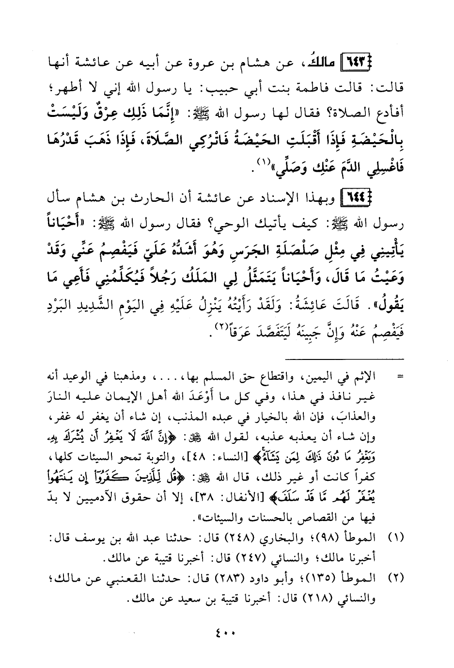 (¬2) الموطأ (135)؛ وأبو داود (283) قال: حدثنا القعنبي عن مالك؛ والنسائيُّ (218) قال: أخبرنا قتيبة بن سعيد عن مالك.