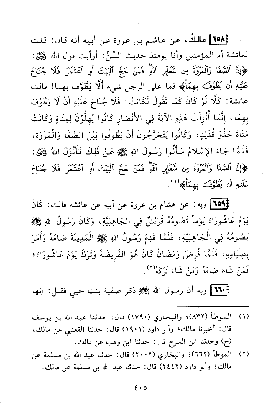 658 - مالكُ، عن هاشم بن عروة عن أبيه أنه قال: قلت لعائشة أم المؤمنين وأنا يومئذ حديث السِّنِّ: أرأيت قول الله -عَزَّ وجَلَّ-: {إِنَّ الصَّفَا وَالْمَرْوَةَ مِنْ شَعَائِرِ اللَّهِ فَمَنْ حَجَّ الْبَيْتَ أَوِ اعْتَمَرَ فَلَا جُنَاحَ عَلَيْهِ أَنْ يَطَّوَّفَ بِهِمَا} فما على الرجل شيء أَلَّا يَطَّوَّف بهما! قالت عائشة: كَلَّا لَوْ كَانَ كَمَا تَقُولُ لَكَانَتْ: فَلَا جُنَاحَ عَلَيْهِ أَنْ لَا يَطَّوَّفَ بِهِمَا، إِنَّمَا أُنْزِلَتْ هَذِهِ الآيَةُ فِي الأَنْصَارِ كَانُوا يُهِلُّوُنَ لِمِنَاةٍ وَكَانَتْ مَنَاةُ حَذْوَ قُدَيْدٍ، وَكَانُوا يَتَحَرَّجُونَ أَنْ يَطُوفُوا بَيْنَ الصَّفَا وَالْمَرْوَة، فَلَمَّا جَاءَ الإِسْلامُ سَأَلُوا رَسُولَ اللهِ - صلى الله عليه وسلم - عَنْ ذَلِكَ فَأَنْزَلَ اللهُ -عَزَّ وجَلَّ-: {إِنَّ الصَّفَا وَالْمَرْوَةَ مِنْ شَعَائِرِ اللَّهِ فَمَنْ حَجَّ الْبَيْتَ أَوِ اعْتَمَرَ فَلَا جُنَاحَ عَلَيْهِ أَنْ يَطَّوَّفَ بِهِمَا} (¬1).