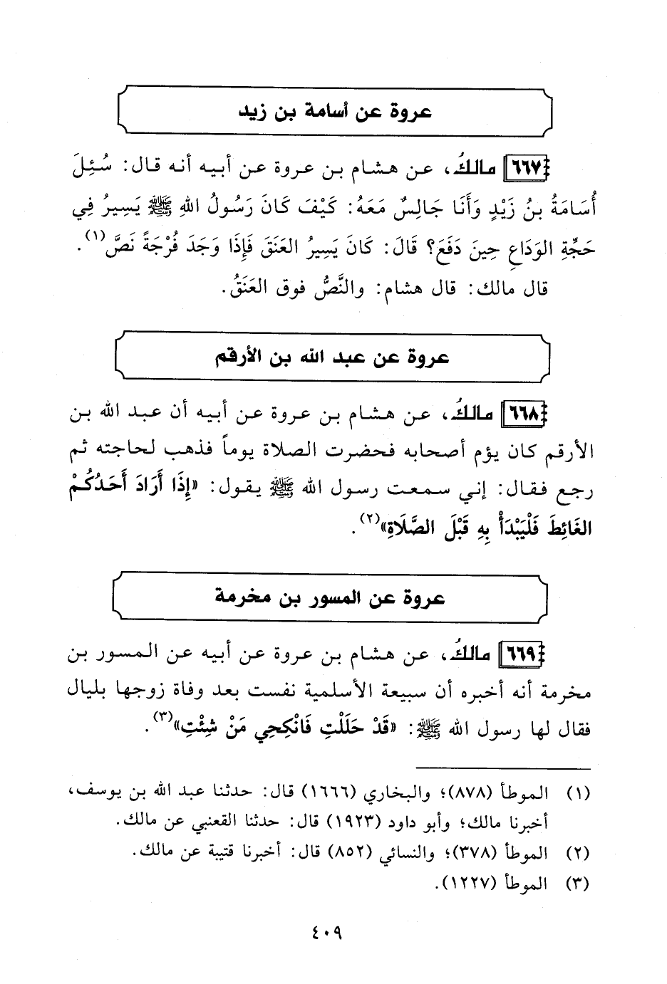 669 - مالكُ، عن هشام بن عروة عن أبيه عن المسور بن مخرمة أنه أخبره أن سبيعة الأسلمية نفست بعد وفاة زوجها بليال فقال لها رسول الله - صلى الله عليه وسلم -: "قَدْ حَلَلْتِ فَانْكِحِي مَنْ شِئْتِ" (¬3).