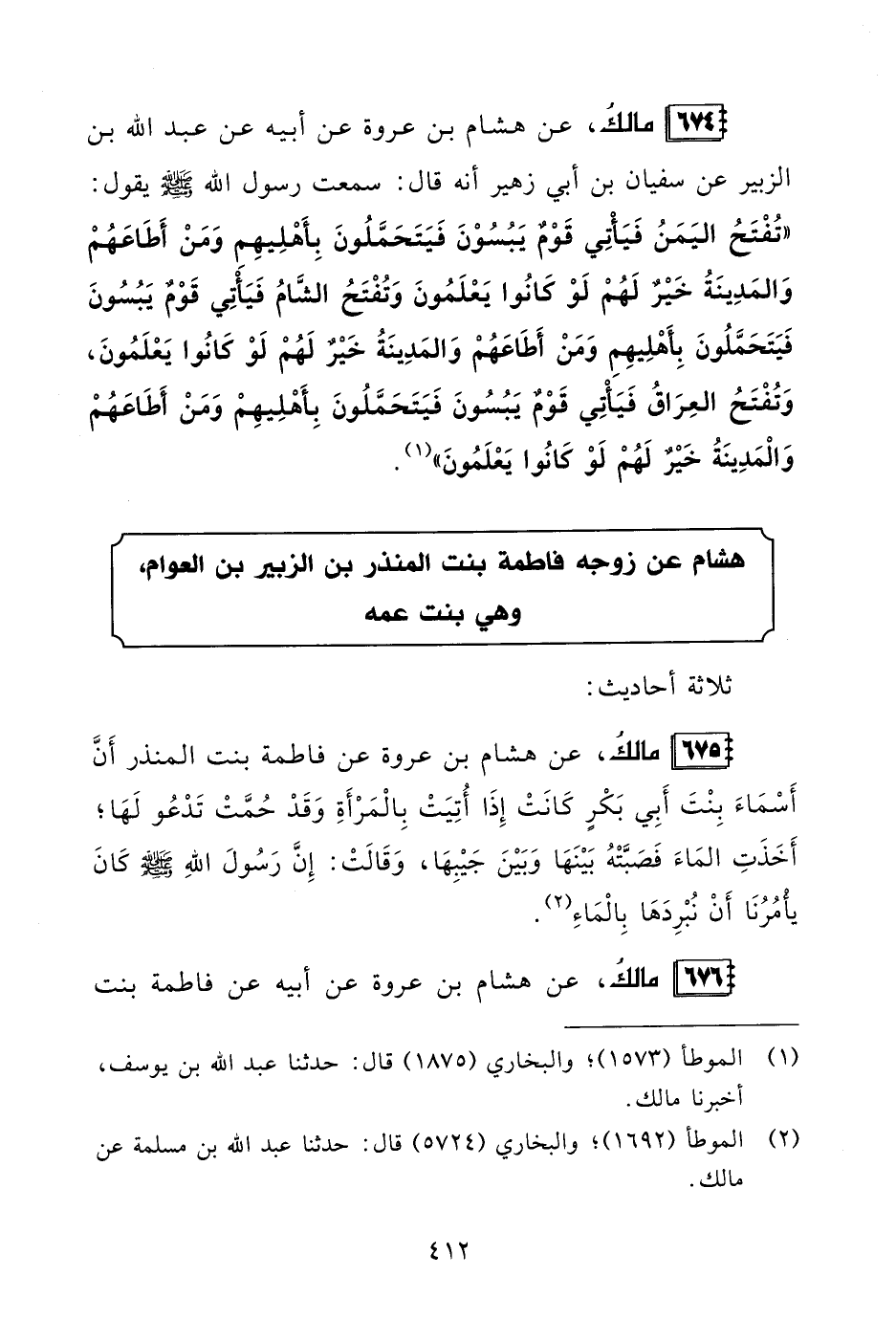 674 - مالكُ، عن هشام بن عروة عن أبيه عن عبد الله بن الزبير عن سفيان بن أبي زهير أنه قال: سمعت رسول الله - صلى الله عليه وسلم - يقول: "تُفْتَحُ اليَمَنُ فَيَأْتِي قَوْمٌ يَبُسُوْنَ فَيَتَحَمَّلُونَ بِأَهْلِيهِمِ وَمَنْ أَطَاعَهُمْ وَالمَدِينَةُ خَيْرٌ لَهُمْ لَوْ كَانُوا يَعْلَمُونَ وَتُفْتَحُ الشَّامُ فَيَأْتِي قَوْمٌ يَبُسُونَ فَيَتَحَمَّلُونَ بِأَهْلِيهِمِ وَمَنْ أَطَاعَهُمْ وَالمَدِينَةٌ خَيْرٌ لَهُمْ لَوْ كَانُوا يَعْلَمُونَ، وَتُفْتَحُ العِرَاقُ فَيَأْتِي قَوْمٌ يَبُسُونَ يَتَحَمَّلُونَ بِأَهْلِيهِمْ وَمَنْ أَطَاعَهُمْ وَالْمَدِينَةُ خَيْرٌ لَهُمْ لَوْ كَانُوا يَعْلَمُونَ" (¬1).