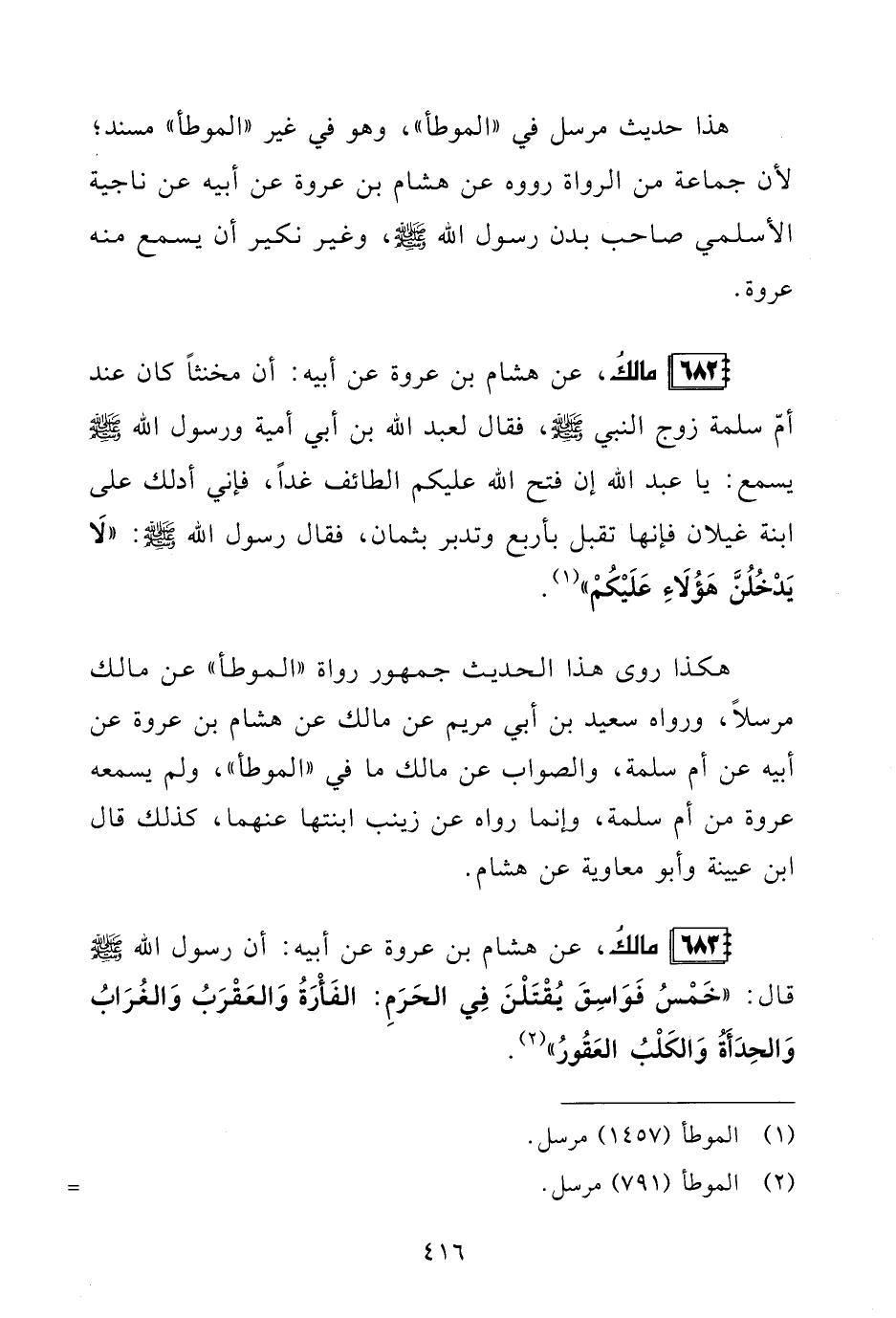 683 - مالكُ، عن هشام بن عروة عن أبيه: أن رسول الله - صلى الله عليه وسلم - قال: "خَمْسُ فَوَاسِقَ يُقْتَلْنَ فِي الحَرَمِ: الفَأْرَةُ وَالعَقْرَبُ وَالغُرَابُ وَالحِدَأَةُ والكَلْبُ العَقُورُ" (¬2).