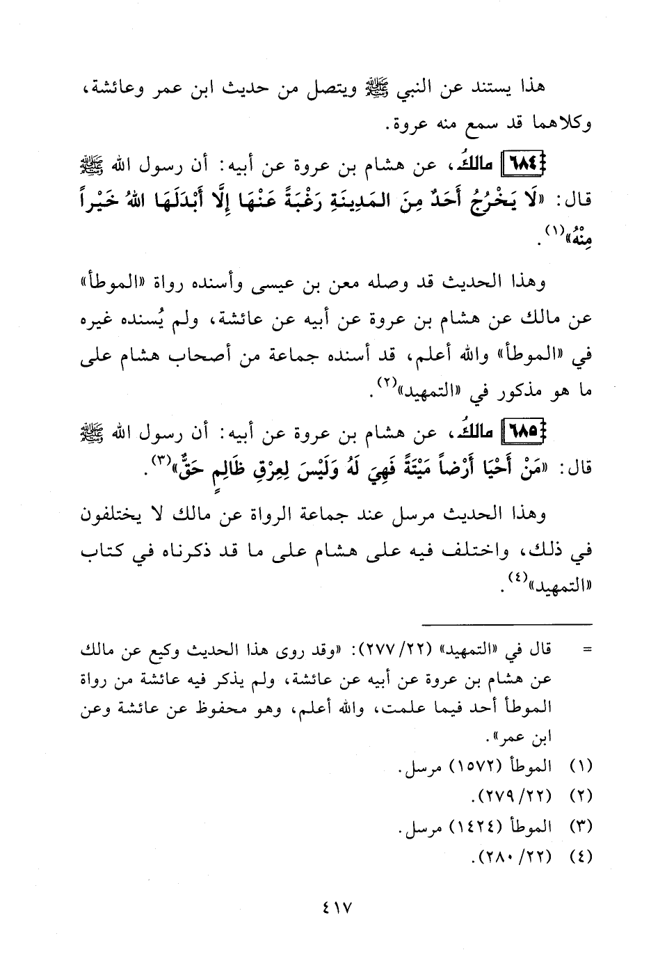 وهذا الحديث قد وصله معن بن عيسى وأسنده رواة "الموطأ" عن مالك عن هشام بن عروة عن أبيه عن عائشة، ولم يُسنده غيره في "الموطأ" والله أعلم، قد أسنده جماعة من أصحاب هشام على ما هو مذكور في "التمهيد" (¬2).