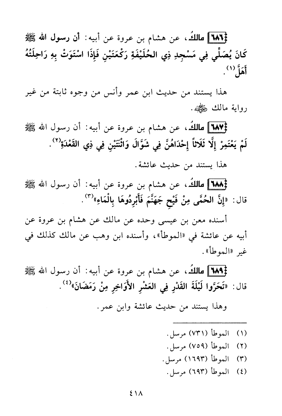 689 - مالكُ، عن هشام بن عروة عن أبيه: أن رسول الله - صلى الله عليه وسلم - قال: "تَحَرَّوا لَيْلَةَ القَدْرِ فِي العَشْرِ الأَوَاخِرِ مِنْ رَمَضَانَ" (¬4).