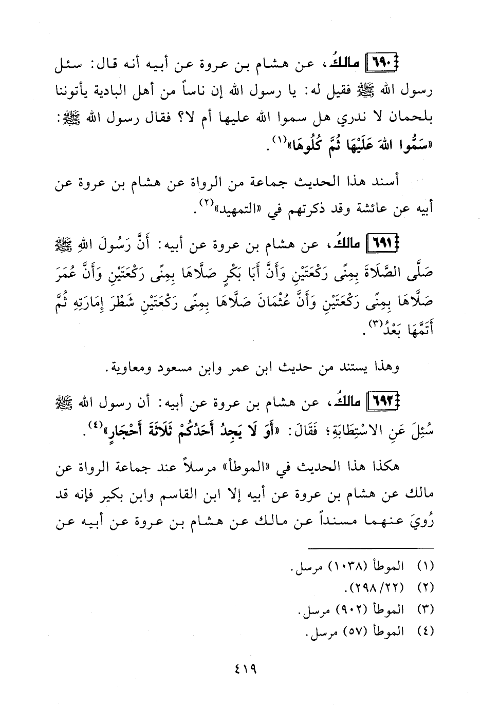 692 - مالكُ، عن هشام بن عروة عن أبيه: أن رسول الله - صلى الله عليه وسلم - سُئِلَ عَنِ الاسْتِطَابَةِ؛ فَقَالَ: "أَوَلَا يَجِدُ أَحَدُكُمْ ثَلَاثَةَ أَحْجَارٍ" (¬4).