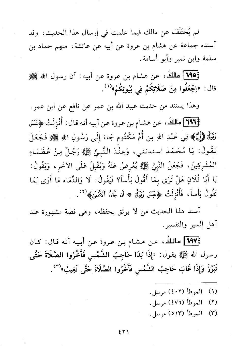 697 - مالكُ، عن هشام بن عروة عن أبيه أنه قال: كان رسول الله - صلى الله عليه وسلم - يقول: "إِذَا بَدَا حَاجِبُ الشَّمْسِ فَأَخِّرُوا الصَّلَاةَ حَتَّى تَبْرُزَ وَإِذَا غَابَ حَاجِبُ الشَّمْسِ فَأَخِّرُوا الصَّلَاةَ حَتَّى تَغِيبُ" (¬3).