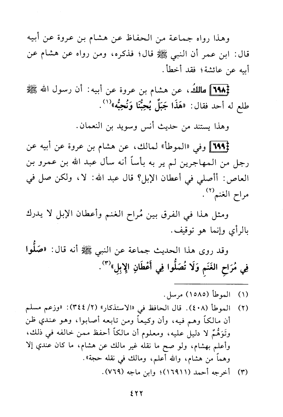 698 - مالكُ، عن هشام بن عروة عن أبيه: أن رسول الله - صلى الله عليه وسلم - طلع له أحد فقال: "هَذَا جَبَلٌ يُحِبُّنَا وَنُحِبُّه" (¬1).