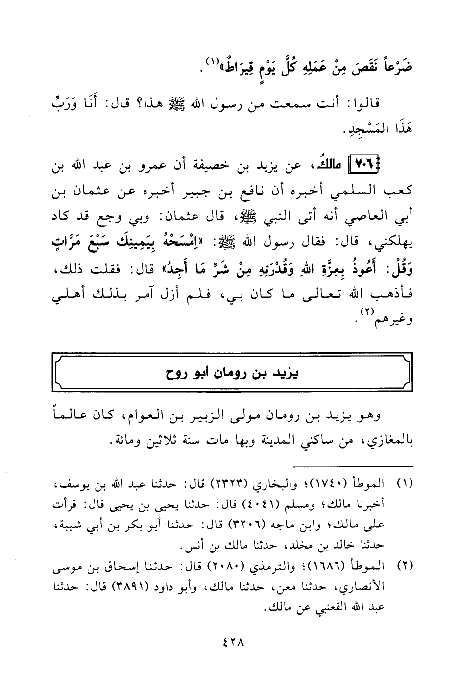 706 - مالكُ، عن يزيد بن خصيفة أن عمرو بن عبد الله بن كعب السلمي أخبره أن نافع بن جبير أخبره عن عثمان بن أبي العاصي أنه أتى النبي - صلى الله عليه وسلم -، قال عثمان: وبي وجع قد كاد يهلكني، قال: فقال رسول الله - صلى الله عليه وسلم -: "اِمْسَحْهُ بِيَمِينِكَ سَبْعَ مَرَّاتٍ وَقُلْ: أَعُوذُ بِعِزَّةِ اللهِ وَقُدْرَتهِ مِنْ شَرِّ مَا أَجِدُ" قال: فقلت ذلك، فأذهب الله تعالى ما كان بي، فلم أزل آمر بذلك أهلي وغيرهم (¬2).