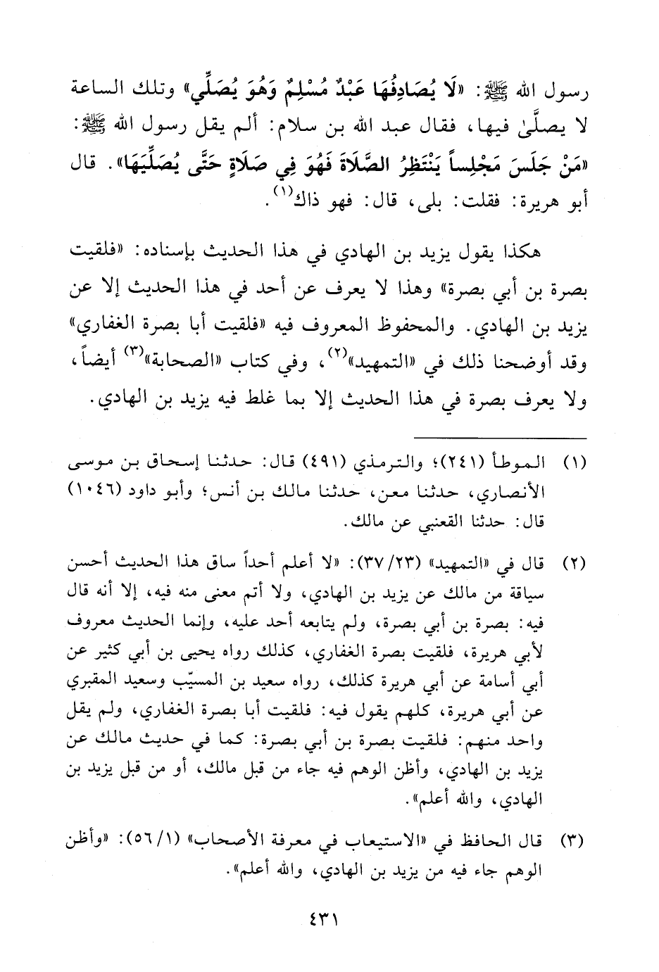 (¬2) قال في "التمهيد" (23/ 37): "لا أعلم أحدًا ساق هذا الحديث أحسن سياقة من مالك عن يزيد بن الهادي، ولا أتم معنى منه فيه، إلا أنه قال فيه: بصرة بن أبي بصرة، ولم يتابعه أحد عليه، وإنما الحديث معروف لأبي هريرة، فلقيت بصرة الغفاري، كذلك رواه يحيى بن أبي كثير عن أبي أسامة عن أبي هريرة كذلك، رواه سعيد بن المسيّب وسعيد المقبري عن أبي هريرة، كلهم يقول فيه: فلقيت أبا بصرة الغفاري، ولم يقل واحد منهم: فلقيت بصرة بن أبي بصرة: كما في حديث مالك عن يزيد بن الهادي، وأظن الوهم فيه جاء من قبل مالك، أو من قبل يزيد بن الهادي، والله أعلم".