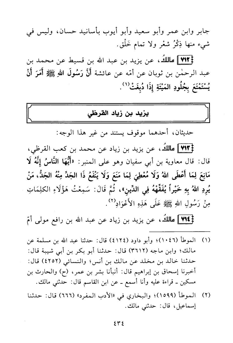 (¬1) الموطأ (1046)؛ وأبو داود (4124) قال: حدثنا عبد الله بن مسلمة عن مالك؛ وابن ماجه (3612) قال: حدثنا أبو بكر بن أبي شيبة قال: حدثنا خالد بن مخلد عن مالك بن أنس؛ والنسائيُّ (4252) قال: أخبرنا إسحاق بن إبراهيم قال: أنبأنا بشر بن عمر، (ح) والحارث بن مسكين -قراءة عليه وأنا أسمع- عن ابن القاسم قال: حدثني مالك.