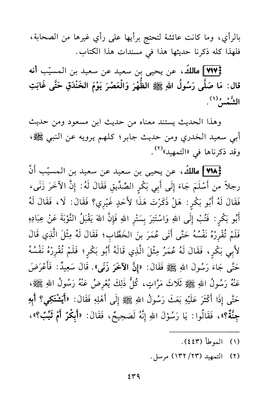 718 - مالكُ، عن يحيى بن سعيد عن سعيد بن المسيّب أَنَّ رجلًا من أَسْلَمَ جَاءَ إِلَى أَبِي بَكْرٍ الصِّدِّيقِ فَقَالَ لَهُ: إِنَّ الآخَرَ زَنَى، فَقَالَ لَهُ أَبُو بَكْرٍ: هَلْ ذَكَرْتَ هَذَا لأَحَدٍ غَيْرِي؟ فَقَالَ: لَا، فَقَالَ لَهُ أَبُو بَكْرٍ: فَتُبْ إِلَى اللهِ وَاسْتَتِرَ بِسَتْرِ اللهِ فَإِنَّ اللهَ يَقْبَلُ التَّوْبَةَ عَنْ عِبَادِهِ فَلَمْ تُقْرِرْهُ نَفْسُهُ حَتَّى أَتَى عُمَرَ بنَ الخَطَّابِ؛ فَقَالَ لَهُ مِثْلَ الَّذِي قَالَ لأَبِي بَكْرٍ، فَقَالَ لَهُ عُمَرُ مِثْلَ الَّذِي قَالَهُ أَبُو بَكْرٍ، فَلَمْ تُقْرِرْهُ نَفْسُهُ حَتَّى جَاءَ رَسُولَ الله - صلى الله عليه وسلم - فقَالَ: "إِنَّ الآخَرَ زَنَى". قَالَ سَعِيدٌ: فَأَعْرَضَ عَنْهُ رَسُولُ اللهِ - صلى الله عليه وسلم - ثَلَاثَ مَرَّاتٍ، كُلُّ ذَلِكَ يُعْرِضُ عَنْهُ رَسُولُ اللهِ - صلى الله عليه وسلم -، حَتَّى إِذَا أَكْثَرَ عَلَيْهِ بَعَثَ رَسُولُ اللهِ - صلى الله عليه وسلم - إِلَى أَهْلِهِ فَقَالَ: "أَيَشْتَكِي؟ أَبِهِ جِنَّةٌ؟ "، فَقَالُوا: يَا رَسُوْلَ اللهِ إِنَّهُ لَصَحِيحٌ، فَقَالَ: "أَبِكْرٌ أَمْ ثَيِّبٌ؟ "،