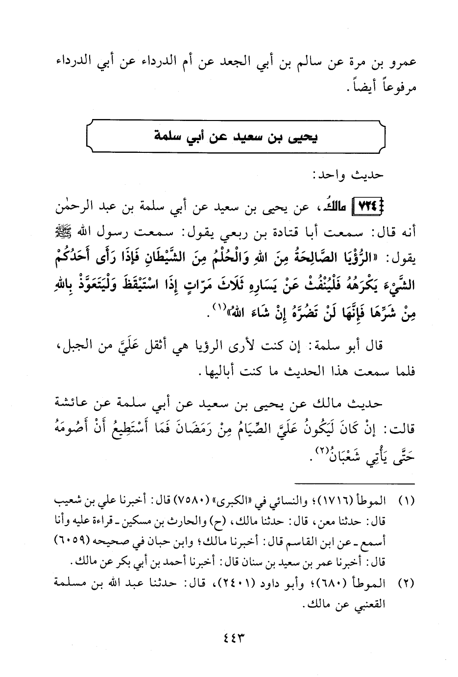 حديث مالك عن يحيى بن سعيد عن أبي سلمة عن عائشة قالت: إنْ كَانَ لَيَكُونُ عَلَيَّ الصِّيَامُ مِنْ رَمَضَانَ فَمَا أَسْتَطِيعُ أَنْ أَصُومَهُ حَتَّى يَأْتِي شَعْبَانُ (¬2).