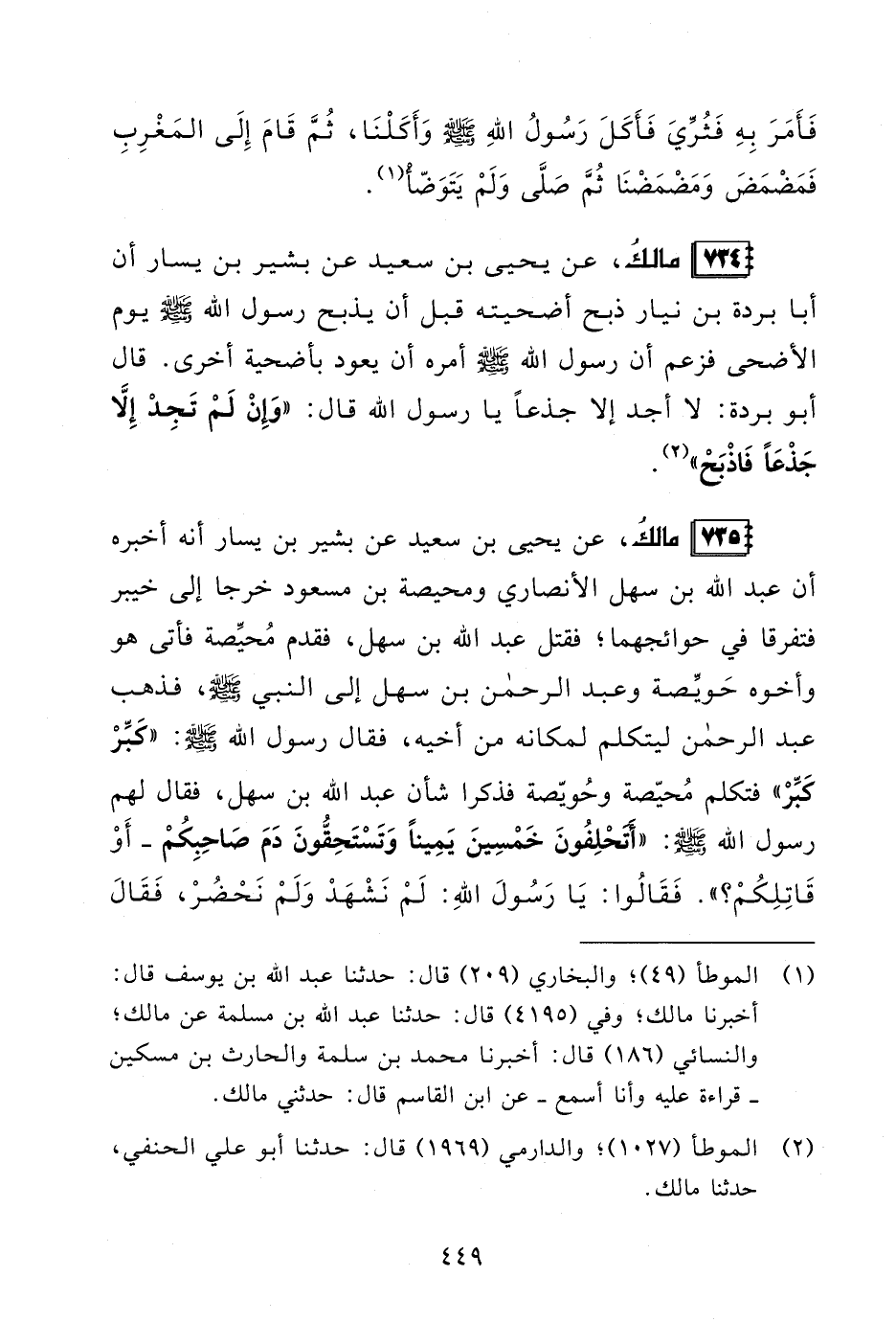 735 - مالكُ، عن يحيى بن سعيد عن بشير بن يسار أنه أخبره أن عبد الله بن سهل الأنصاري ومحيصة بن مسعود خرجا إلى خيبر فتفرقا في حوائجهما؛ فقتل عبد الله بن سهل، فقدم مُحيِّصة فأتى هو وأخوه حَويِّصة وعبد الرحمن بن سهل إلى النبي- صلى الله عليه وسلم -، فذهب عبد الرحمن ليتكلم لمكانه من أخيه، فقال رسول الله- صلى الله عليه وسلم -: "كَبِّرْ كَبِّرْ" فتكلم مُحيّصة وحُويّصة فذكرا شأن عبد الله بن سهل، فقال لهم رسول الله - صلى الله عليه وسلم -: "أَتَحْلِفُونَ خَمْسِينَ يَمِينًا وَتَسْتَحِقُّونَ دَمَ صَاحِبِكُمْ -أَوْ قَاتِلِكُمْ؟ ". فَقَالُوا: يَا رَسُولَ اللهِ: لَمْ نَشْهَدْ وَلَمْ نَحْضُرْ، فَقَالَ