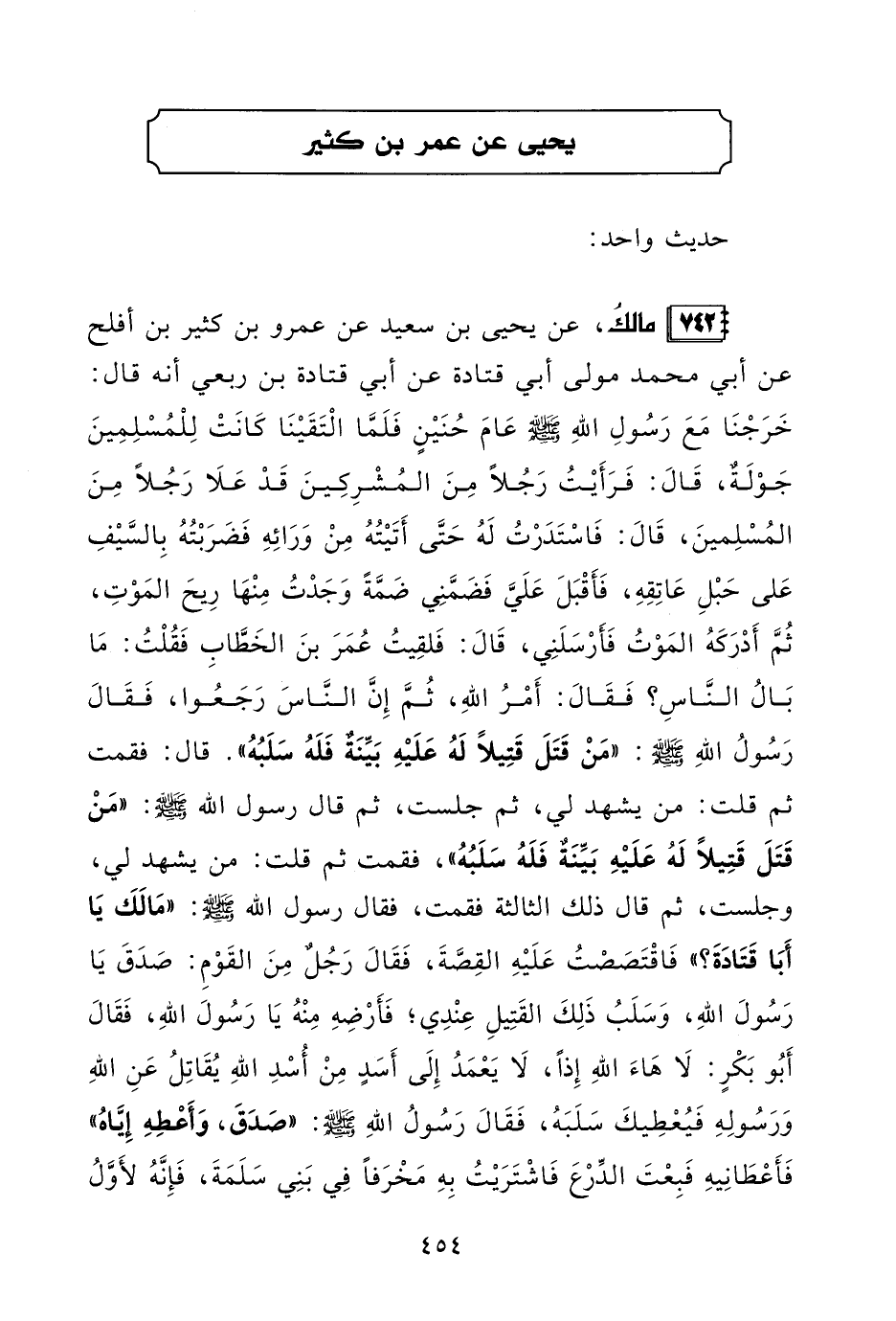 742 - مالكُ، عن يحيى بن سعيد عن عمرو بن كثير بن أفلح عن أبي محمد مولى أبي قتادة عن أبي قتادة بن ربعي أنه قال: خَرَجْنَا مَعَ رَسُولِ اللهِ - صلى الله عليه وسلم - عَامَ حُنَيْنٍ فَلَمَّا الْتَقَيْنَا كَانَتْ لِلْمُسْلِمِينَ جَوْلَةٌ، قَالَ: فَرَأَيْتُ رَجُلًا مِنَ المُشْرِكِينَ قَدْ عَلَا رَجُلًا مِنَ المُسْلِمينَ، قَالَ: فَاسْتَدَرْتُ لَهُ حَتَّى أَتَيْتُهُ مِنْ وَرَائِهِ فَضَرَبْتُهُ بِالسَّيْفِ عَلى حَبْلِ عَاتِقِهِ، فَأَقْبَلَ عَلَيَّ فَضَمَّنِي ضَمَّةً وَجَدْتُ مِنْهَا رِيحَ المَوْتِ، ثُمَّ أَدْرَكَهُ المَوْتُ فَأَرْسَلَنِي، قَالَ: فَلقِيتُ عُمَرَ بنَ الخَطَّابِ فَقُلْتُ: مَا بَالُ النَّاسِ؟ فَقَالَ: أَمْرُ اللهِ، ثُمَّ إِنَّ النَّاسَ رَجَعُوا، فَقَالَ رَسُولُ اللهِ - صلى الله عليه وسلم -: "مَنْ قَتَلَ قَتِيلًا لَهُ عَلَيْهِ بَيِّنَةٌ فَلَهُ سَلَبُهُ". قال: فقمت ثم قلت: من يشهد لي، ثم جلست، ثم قال رسول الله - صلى الله عليه وسلم -: "مَنْ قَتَلَ قَتِيلًا لَهُ عَلَيْهِ بَيِّنَةٌ فَلَهُ سَلَبُهُ"، فقمت ثم قلت: من يشهد لي، وجلست، ثم قال ذلك الثالثة فقمت، فقال رسول الله - صلى الله عليه وسلم -: "مَا لَكَ يَا أَبَا قَتَادَةَ؟ " فَاقْتَصَصْتُ عَلَيْهِ القِصَّةَ، فَقَالَ رجُلٌ مِنَ القَوْمِ: صَدَقَ يَا رَسُولَ اللهِ، وَسَلَبُ ذَلِكَ القَتِيلِ عِنْدِي؛ فَأَرْضِهِ مِنْهُ يَا رَسُولَ اللهِ، فَقَالَ أَبُو بَكْرٍ: لَا هَاءَ اللهِ إِذًا، لَا يَعْمَدُ إِلَى أَسَدٍ مِنْ أُسْدِ اللهِ يُقَاتِلُ عَنِ اللهِ وَرَسُولِهِ فَيُعْطِيكَ سَلَبَهُ، فَقَالَ رَسُولُ اللهِ - صلى الله عليه وسلم -: "صَدَقَ، وَأَعْطِهِ إِيَّاهُ" فَأَعْطَانِيهِ فَبِعْتَ الدِّرْعَ فَاشْتَرَيْتُ بِهِ مَخْرَفًا فِي بَنِي سَلَمَةَ، فَإِنَّهُ لأَوَّلُ