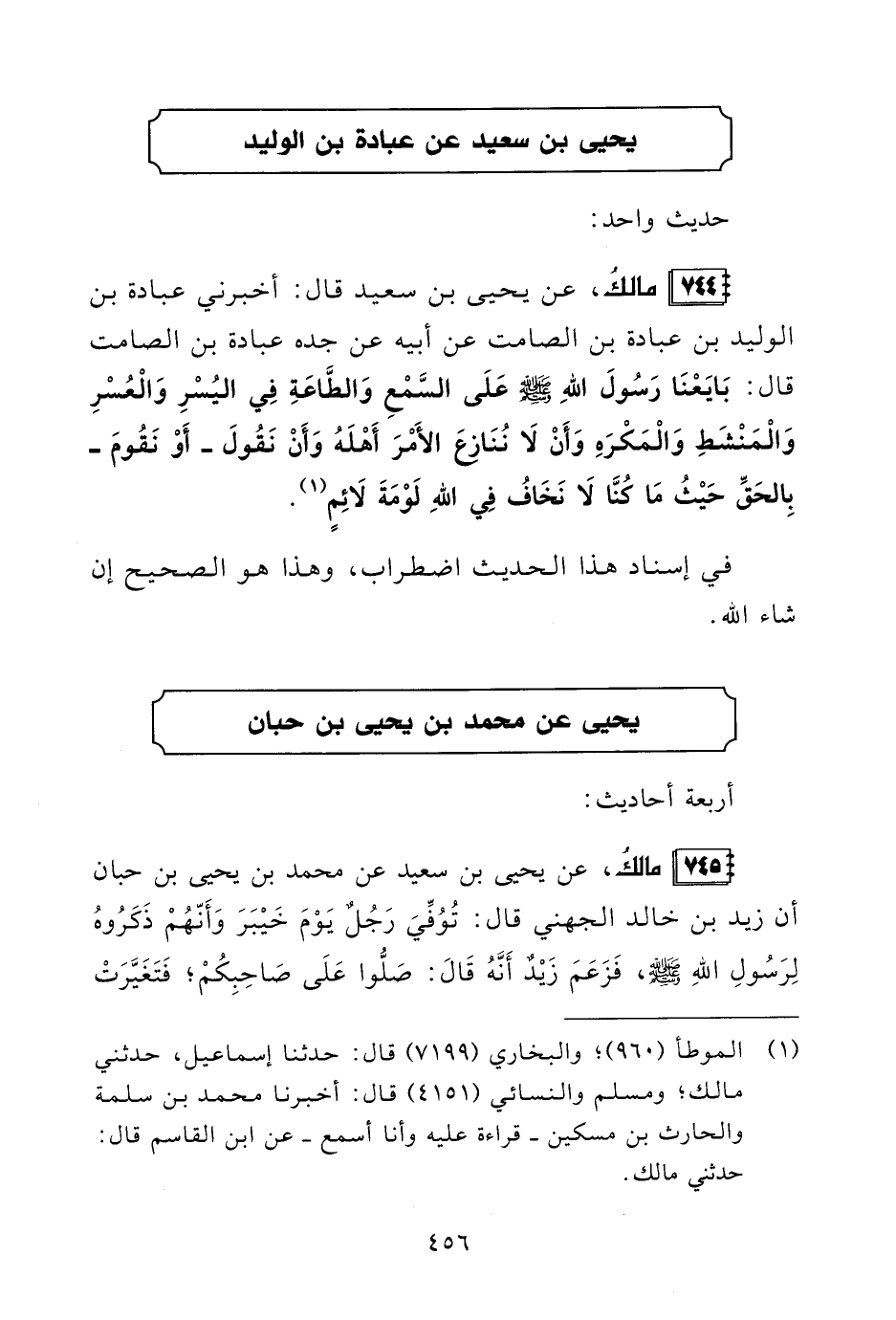 744 - مالكُ، عن يحيى بن سعيد قال: أخبرني عبادة بن الوليد بن عبادة بن الصامت عن أبيه عن جده عبادة بن الصامت قال: بَايَعْنَا رَسُولَ اللهِ - صلى الله عليه وسلم - عَلَى السَّمْعِ وَالطَّاعَةِ فِي اليُسْرِ وَالْعُسْرِ وَالْمَنْشَطِ وَالْمَكْرَهِ وَأَنْ لَا نُنَازعَ الأَمْرَ أَهْلَهُ وَأَنْ نَقُولَ -أَوْ نَقُومَ- بِالحَقِّ حَيْثُ مَا كُنَّا لَا نَخَافُ فِي اللهِ لَوْمَةَ لَائِمٍ (¬1).