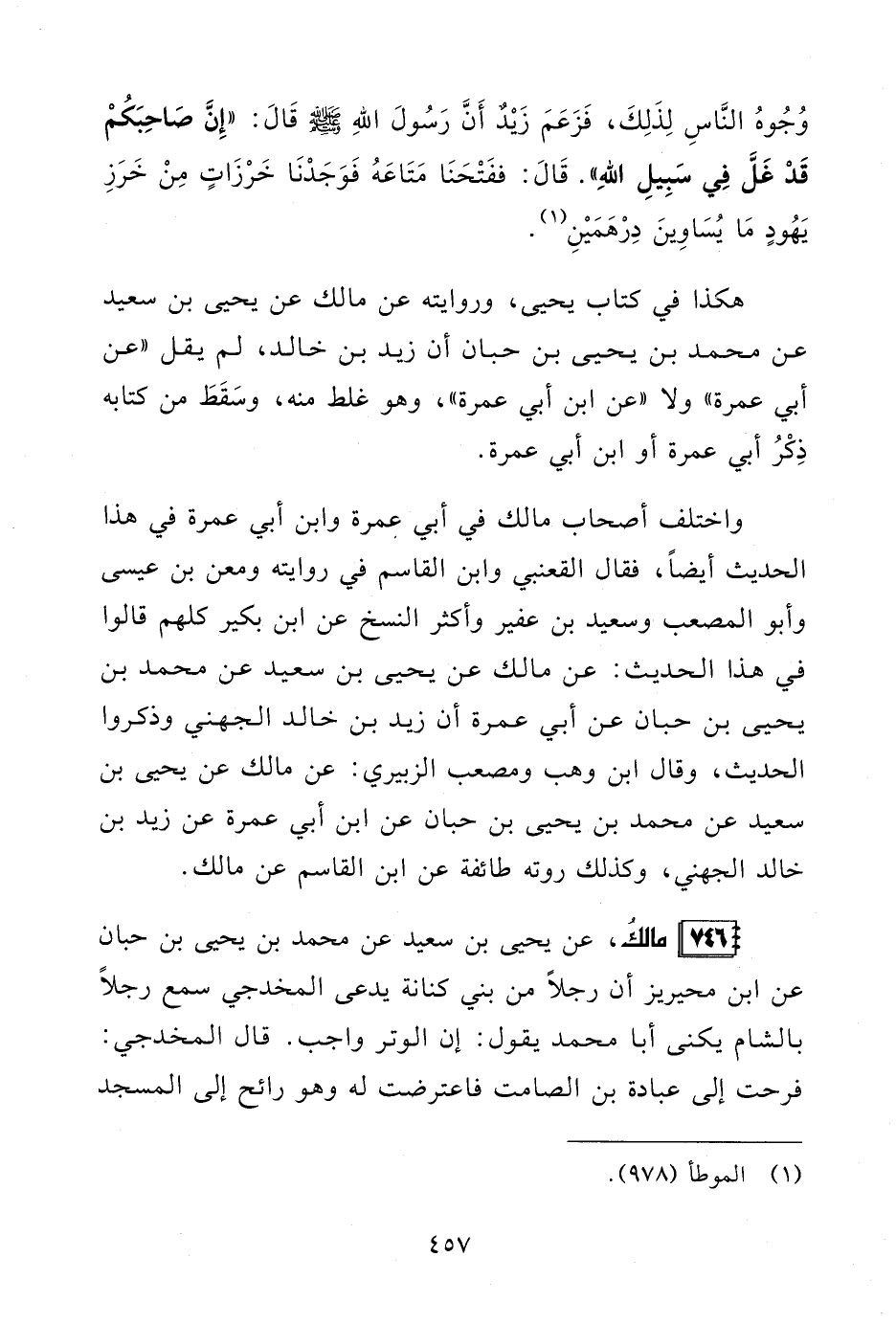 746 - مالكُ، عن يحيى بن سعيد عن محمد بن يحيى بن حبان عن ابن محيريز أن رجلًا من بني كنانة يدعى المخدجي سمع رجلًا بالشام يكنى أبا محمد يقول: إن الوتر واجب. قال المخدجي: فرحت إلى عبادة بن الصامت فاعترضت له وهو رائح إلى المسجد
