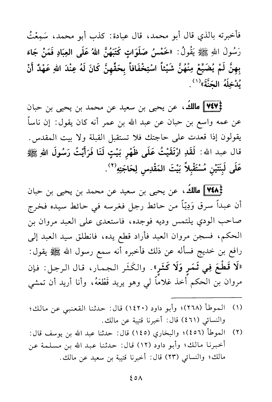 (¬2) الموطأ (456)؛ والبخاريُّ (145) قال: حدثنا عبد الله بن يوسف قال: أخبرنا مالك؛ وأبو داود (12) قال: حدثنا عبد الله بن مسلمة عن مالك؛ والنسائيُّ (23) قال: أخبرنا قتيبة بن سعيد عن مالك.