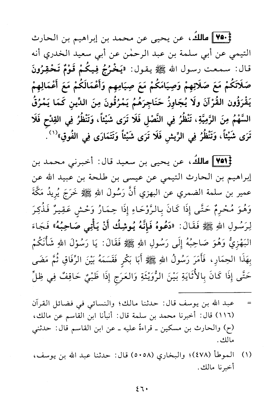 750 - مالكُ، عن يحيى عن محمد بن إبراهيم بن الحارث التيمي عن أبي سلمة بن عبد الرحمن عن أبي سعيد الخدري أنه قال: سمعت رسول الله - صلى الله عليه وسلم - يقول: "يَخْرُجُ فِيكُمْ قَوْمٌ تَحْقِرُونَ صَلَاتَكُمْ مَعَ صَلَاتِهِمْ وَصِيَامَكُمْ مَعَ صِيَامِهِم وَأَعْمَالَكُمْ مَعَ أَعْمَالِهِمْ يَقْرَؤُون القُرْآنَ ولَا يُجَاوِزُ حَنَاجِرَهُمُ يَمْرُقُونَ مِنَ الدِّينِ كمَا يَمْرُقُ السَّهْمُ مِنَ الرَّمِيَّةِ، تَنْظُرُ فِي النَّصْلِ فَلَا تَرَى شَيْئًا، وَتَنْظُرُ فِي القِدْحِ فَلَا تَرَى شَيْئًا، وَتَنْظُرُ فِي الرِّيشِ فَلَا تَرَى شَيْئًا وَتَتَمَارَى فِي الفُوقِ" (¬1).
