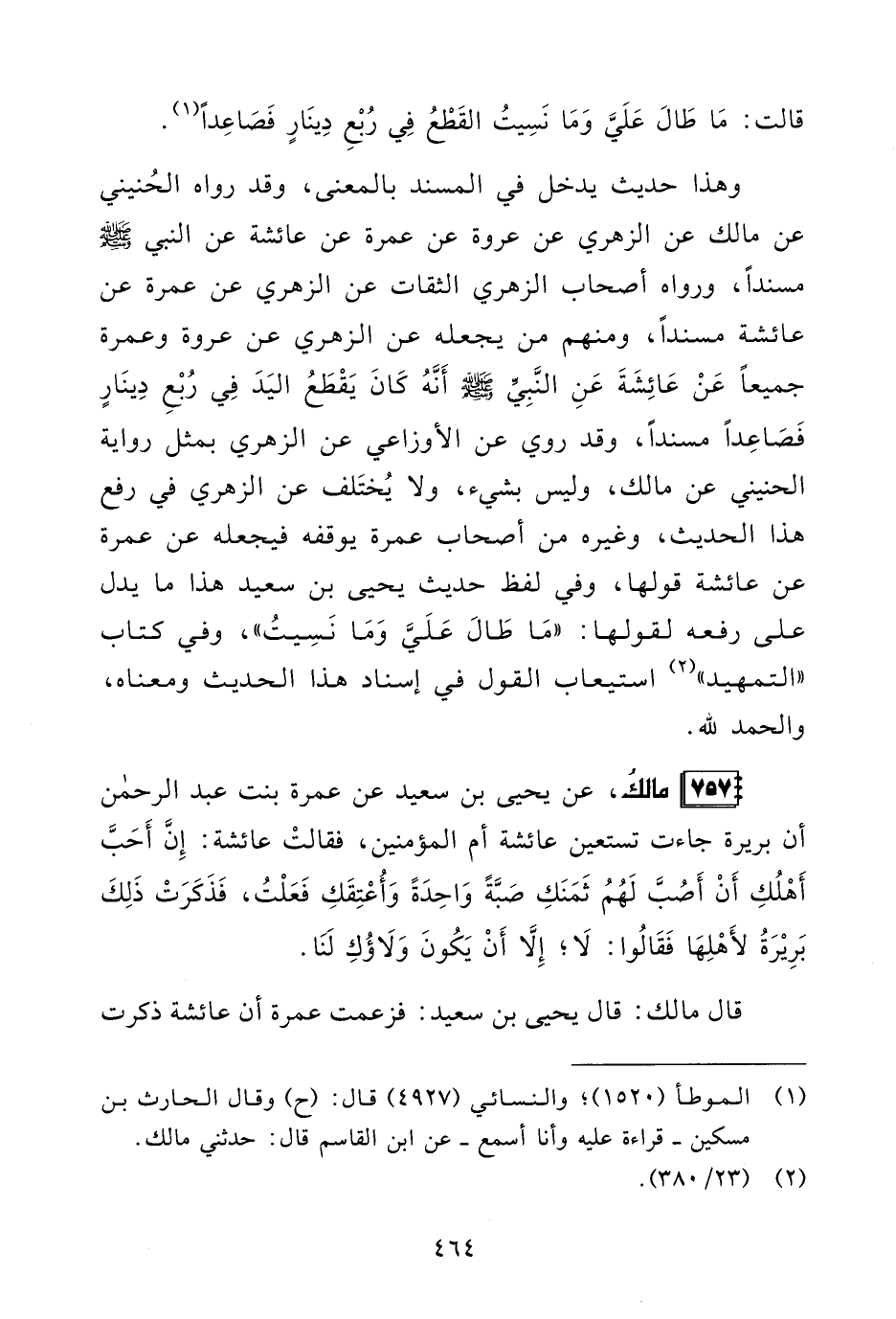وهذا حديث يدخل في المسند بالمعنى، وقد رواه الحُنيني عن مالكُ عن الزهري عن عروة عن عمرة عن عائشة عن النبي - صلى الله عليه وسلم - مسندًا، ورواه أصحاب الزهري الثقات عن الزهري عن عمرة عن عائشة مسندًا، ومنهم من يجعله عن الزهري عن عروة وعمرة جميعًا عَنْ عَائِشَةَ عَنِ النَّبِيِّ - صلى الله عليه وسلم - أَنَّهُ كَانَ يَقْطَعُ اليَدَ فِي رُبْعِ دِينَارٍ فَصاعِدًا مسندًا، وقد روي عن الأوزاعي عن الزهري بمثل رواية الحنيني عن مالك، وليس بشيء، ولا يُختَلف عن الزهري في رفع هذا الحديث، وغيره من أصحاب عمرة يوقفه فيجعله عن عمرة عن عائشة قولها، وفي لفظ حديث يحيى بن سعيد هذا ما يدل على رفعه لقولها: "مَا طَالَ عَلَيَّ وَمَا نَسِيتُ"، وفي كتاب "التمهيد" (¬2) استيعاب القول في إسناد هذا الحديث ومعناه، والحمد لله.