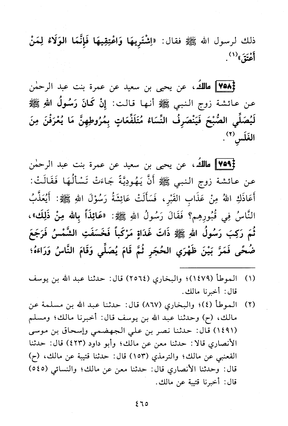 (¬2) الموطأ (4)؛ والبخاريُّ (867) قال: حدثنا عبد الله بن مسلمة عن مالك، (ح) وحدثنا عبد الله بن يوسف قال: أخبرنا مالك؛ ومسلمٌ (1491) قال: حدثنا نصر بن علي الجهضمي وإسحاق بن موسى الأنصاري قالا: حدثنا معن عن مالك؛ وأبو داود (423) قال: حدثنا القعنبي عن مالك؛ والترمذيُّ (153) قال: حدثنا قتيبة عن مالك؛ (ح) قال: وحدثنا الأنصاري قال: حدثنا معن عن مالك؛ والنسائيُّ (545) قال: أخبرنا قتيبة عن مالك.
