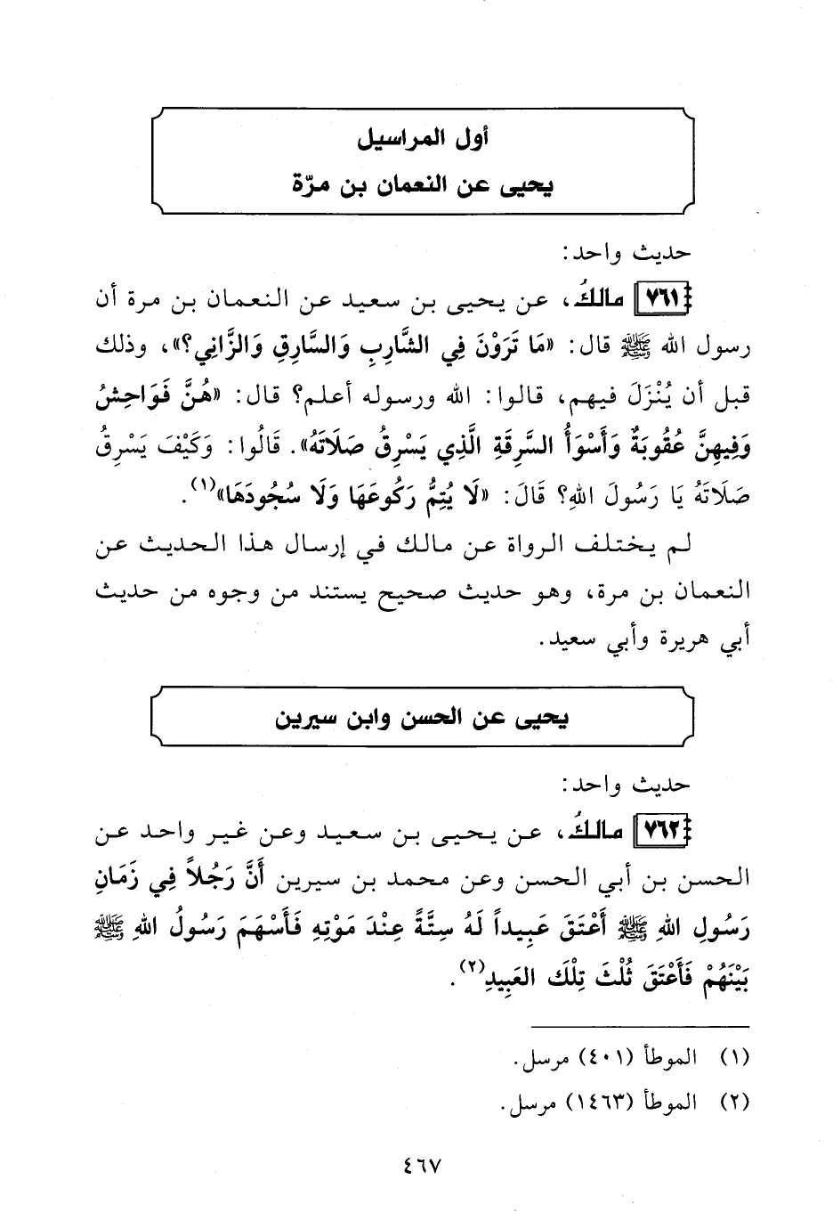 761 - مالكُ، عن يحيى بن سعيد عن النعمان بن مرة أن رسول الله - صلى الله عليه وسلم - قال: "مَا تَرَوْنَ فِي الشَّارِبِ وَالسَّارِقِ وَالزَّانِي؟ "، وذلك قبل أن يُنْزَلَ فيهم، قالوا: الله ورسوله أعلم؟ قال: "هُنَّ فَوَاحِشُ وَفِيهِنَّ عُقُوبَةٌ وَأَسْوَأُ السَّرِقَةِ الَّذِي يَسْرِقُ صَلَاتَهُ". قَالُوا: وَكَيْفَ يَسْرِقُ صَلَاتَهُ يَا رَسُولَ اللهِ؟ قَالَ: "لَا يُتِمُّ رَكُوعَهَا وَلَا سُجُودها" (¬1).