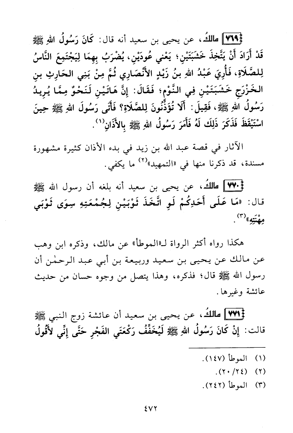 769 - مالكُ، عن يحيى بن سعيد أنه قال: كَانَ رَسُولُ اللهِ - صلى الله عليه وسلم - قَدْ أَرَادَ أَنْ يَتَّخِذَ خَشَبَتَيْنِ؛ يَعْني عُودَيْنِ، يُضْرَبُ بِهِمَا لِيَجْتَمِعَ النَّاسُ لِلصَّلَاةِ، فَأُرِيَ عَبْدُ اللهِ بنُ زَيْدٍ الأَنْصَارِي ثُمَّ مِنْ بَنِي الحَارِثِ بنِ الخَزْرَجِ خَشَبَتَيْنِ فِي النَّوْمِ؛ فَقَالَ: إِنَّ هَاتَيْنِ لَنَحْوٌ مِمَّا يُرِيدُ رَسُولُ اللهِ - صلى الله عليه وسلم -، فَقِيلَ: أَلَا تُؤَذِّنُونَ لِلصَّلَاةِ؟ فَأَتَى رَسُولَ اللهِ - صلى الله عليه وسلم - حِينَ اسْتَيْقَظَ فَذَكَرَ ذَلِكَ لَهُ فَأَمَرَ رَسُولُ اللهِ - صلى الله عليه وسلم - بِالأَذَانِ (¬1).