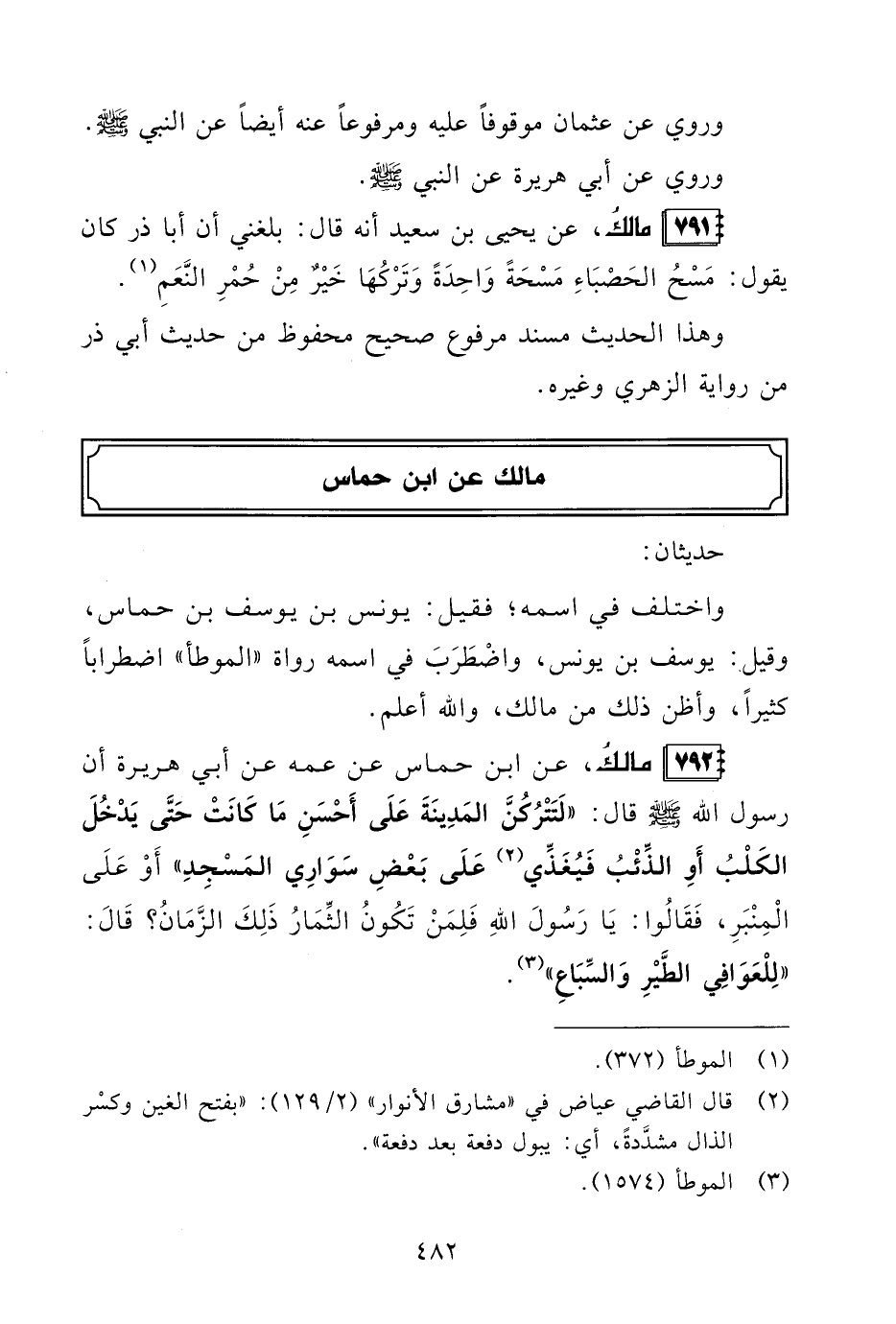 792 - مالكُ، عن ابن حماس عن عمه عن أبي هريرة أن رسول الله - صلى الله عليه وسلم - قال: "لَتَتْرُكُنَّ المَدِينَةَ عَلَى أَحْسَنِ مَا كَانَتْ حَتَّى يَدْخُلَ الكَلْبُ أَوِ الذِّئْبُ فَيُغَذِّي (¬2) عَلَى بَعْضِ سَوَارِي المَسْجِدِ" أَوْ عَلَى الْمِنْبَرِ، فَقَالُوا: يَا رَسُولَ اللهِ فَلِمَنْ تَكُونُ الثِّمَارُ ذَلِكَ الزَّمَانُ؟ قَالَ: "لِلْعَوَافِي الطَّيْرِ وَالسِّبَاعِ" (¬3).