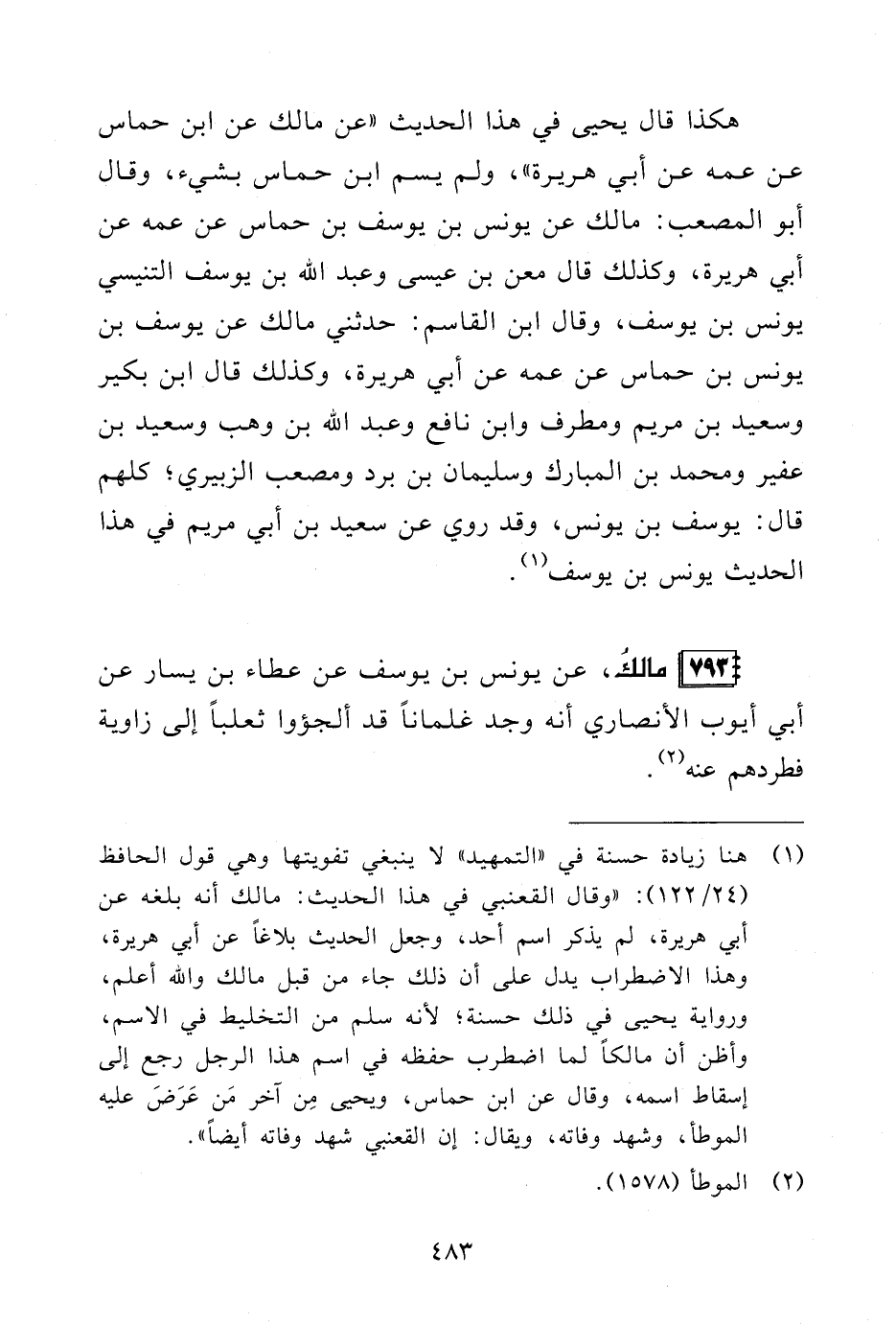 (¬1) هنا زيادة حسنة في "التمهيد" لا ينبغي تفويتها وهي قول الحافظ (24/ 122): "وقال القعنبي في هذا الحديث: مالك أنه بلغه عن أبي هريرة، لم يذكر اسم أحد، وجعل الحديث بلاغًا عن أبي هريرة، وهذا الاضطراب يدل على أن ذلك جاء من قبل مالك والله أعلم، ورواية يحيى في ذلك حسنة؛ لأنه سلم من التخليط في الاسم، وأظن أن مالكًا لما اضطرب حفظه في اسم هذا الرجل رجع إلى إسقاط اسمه، وقال عن ابن حماس، ويحيى مِن آخر مَن عَرَضَ عليه الموطأ، وشهد وفاته، ويقال: إن القعنبي شهد وفاته أيضًا".