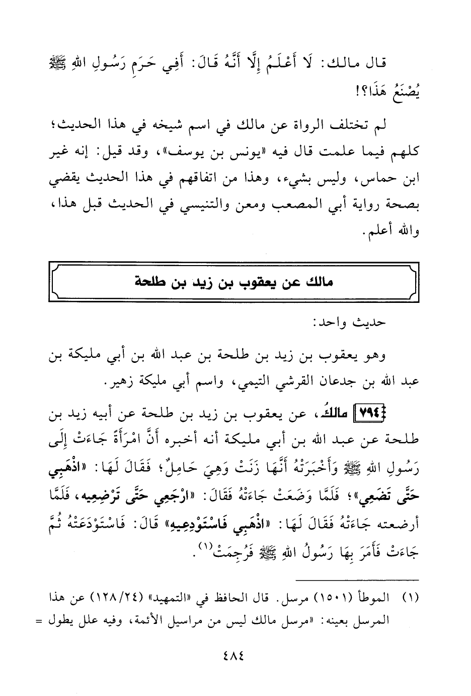 794 - مالكُ، عن يعقوب بن زيد بن طلحة عن أبيه زيد بن طلحة عن عبد الله بن أبي مليكة أنه أخبره أَنَّ امْرَأَةً جَاءَتْ إِلَى رَسُولِ اللهِ - صلى الله عليه وسلم - وأَخْبَرَتْهُ أَنَّهَا زَنَتْ وَهِيَ حَامِلٌ؛ فَقَالَ لَهَا: "اذْهَبِي حَتَّى تَضَعِي"؛ فَلَمَّا وَضَعَتْ جَاءَتْهُ فَقَالَ: "ارْجَعِي حَتَّى تَرْضِعِيه، فَلَمَّا أرضعته جَاءَتْهُ فَقَالَ لَهَا: "اذْهَبِي فَاسْتَوْدِعِيهِ" قَالَ: فَاسْتَوْدَعَتْهُ ثُمَّ جَاءَتْ فَأَمَرَ بِهَا رَسُولُ اللهِ - صلى الله عليه وسلم - فَرُجِمَت (¬1).