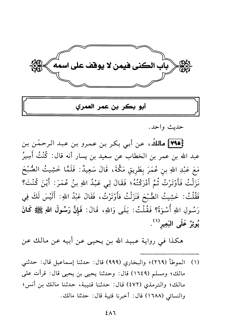 795 - مالكُ، عن أبي بكر بن عمرو بن عبد الرحمن بن عبد الله بن عمر بن الخطاب عن سعيد بن يسار أنه قال: كُنْتُ أَسِيرُ مَعَ عَبْدِ اللهِ بنِ عُمَرَ بِطَرِيقِ مَكَّةَ، قَالَ سَعِيدٌ: فَلَمَّا خَشِيتُ الصُّبْحَ نَزَلْتُ فَأَوْتَرْتُ ثُمَّ أَدْرَكْتُهُ؛ فَقَالَ لِي عَبْدُ اللهِ بنُ عُمَرَ: أَيْنَ كُنْتَ؟ فَقُلْتُ: خَشِيتُ الصبْحَ فَنَزَلْتُ فأَوْتَرْتُ، فَقَالَ عَبْدُ اللهِ: أَلَيْسَ لَكَ فِي رَسُولِ اللهِ أُسْوَةً؟ فَقُلْتُ: بَلَى وَاللهِ، قَالَ: فَإِنَّ رَسُولَ اللهِ - صلى الله عليه وسلم - كَانَ يُوتِرُ عَلَى البَعِيرِ (¬1).