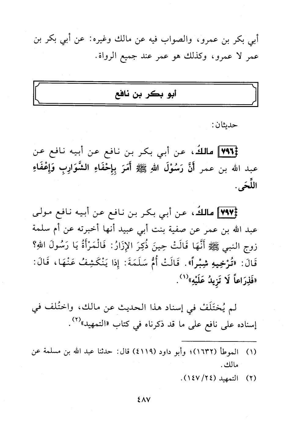 797 - مالكُ، عن أبي بكر بن نافع عن أبيه نافع مولى عبد الله بن عمر عن صفية بنت أبي عبيد أنها أخبرته عن أم سلمة زوج النبي - صلى الله عليه وسلم - أَنَّهَا قَالَتْ حِينَ ذُكِرَ الإِزَارُ: فَالْمَرْأَةُ يَا رَسُولَ اللهِ؟ قَالَ: "تُرْخِيهِ شِبْرًا". قَالَتْ أُمُّ سَلَمَةَ: إِذا يَنْكَشِفُ عَنْهَا، قَالَ: "فَذِرَاعًا لَا تَزِيدُ عَلَيْهِ" (¬1).