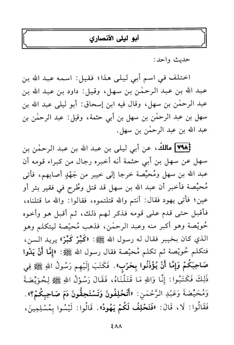 798 - مالكُ، عن أبي ليلى بن عبد الله بن عبد الرحمن بن سهل عن سهل بن أبي حثمة أنه أخبره رجال من كبراء قومه أن عبد الله بن سهل ومُحيِّصة خرجا إلى خيبر من جَهْدٍ أصابهم، فأتى مُحيِّصة فأخبر أن عبد الله بن سهل قد قتل وطُرح في فقير بئر أو عين؛ فأتى يهود فقال: أنتم والله قتلتموه، فقالوا: والله ما قتلناه، فأقبل حتى قدم على قومه فذكر لهم ذلك، ثم أقبل هو وأخوه حُويّصة وهو أكبر منه وعبد الرحمن، فذهب مُحيّصة ليتكلم وهو الذي كان بخيبر فقال له رسول الله - صلى الله عليه وسلم -: "كَبِّرْ كبِّرْ" يريد السن، فتكلم حُويّصة ثم تكلم مُحيّصة فقال رسول الله - صلى الله عليه وسلم -: "إِمَّا أَنْ يَدُوا صَاحِبَكُمْ وَإِمَّا أَنْ يُؤْذَنُوا بِحَرْبٍ". فَكَتَبَ إِلَيْهِم رَسُولُ اللهِ - صلى الله عليه وسلم - في ذَلِكَ فَكَتَبُوا: إِنَّا وَاللهِ مَا قَتَلْنَاهُ، فَقَال رَسُوْلُ اللهِ - صلى الله عليه وسلم - لحُوَيِّصَةَ وَمُحَيِّصَةَ وَعَبْدِ الرَّحْمَنِ: "أَتَحْلِفُونَ وَتَسْتَحِقُّونَ دَمَ صَاحِبِكُمْ؟ ". فَقَالُوا: لَا، قَالَ: "فَتَحْلِفُ لَكُمْ يَهُودُ". قَالُوا: لَيْسُوا بِمُسْلِمِينَ،