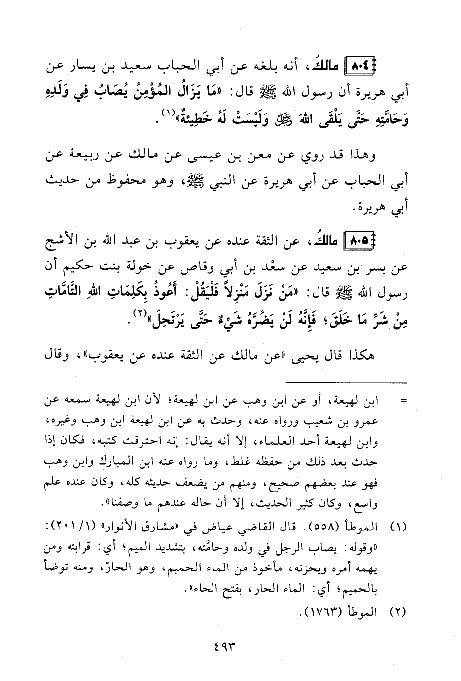 804 - مالكُ، أنه بلغه عن أبي الحباب سعيد بن يسار عن أبي هريرة أن رسول الله - صلى الله عليه وسلم - قال: "مَا يَزَالُ المُؤْمِنُ يُصَابُ فِي وَلَدِهِ وَحَامَّتِهِ حَتَّى يَلْقَى اللهَ -عَزَّ وجَلَّ- وَلَيْسَتْ لَهُ خَطِيئةٌ" (¬1).