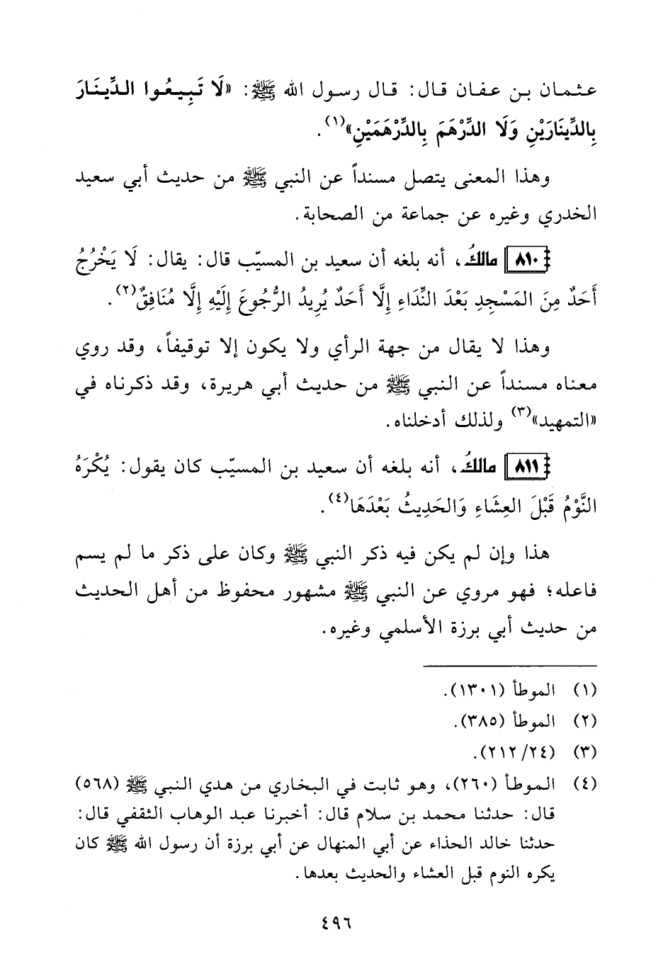 (¬4) الموطأ (260)، وهو ثابت في البخاري من هدي النبي - صلى الله عليه وسلم - (568) قال: حدثنا محمد بن سلام قال: أخبرنا عبد الوهاب الثقفي قال: حدثنا خالد الحذاء عن أبي المنهال عن أبي برزة أن رسول الله - صلى الله عليه وسلم - كان يكره النوم قبل العشاء والحديث بعدها.