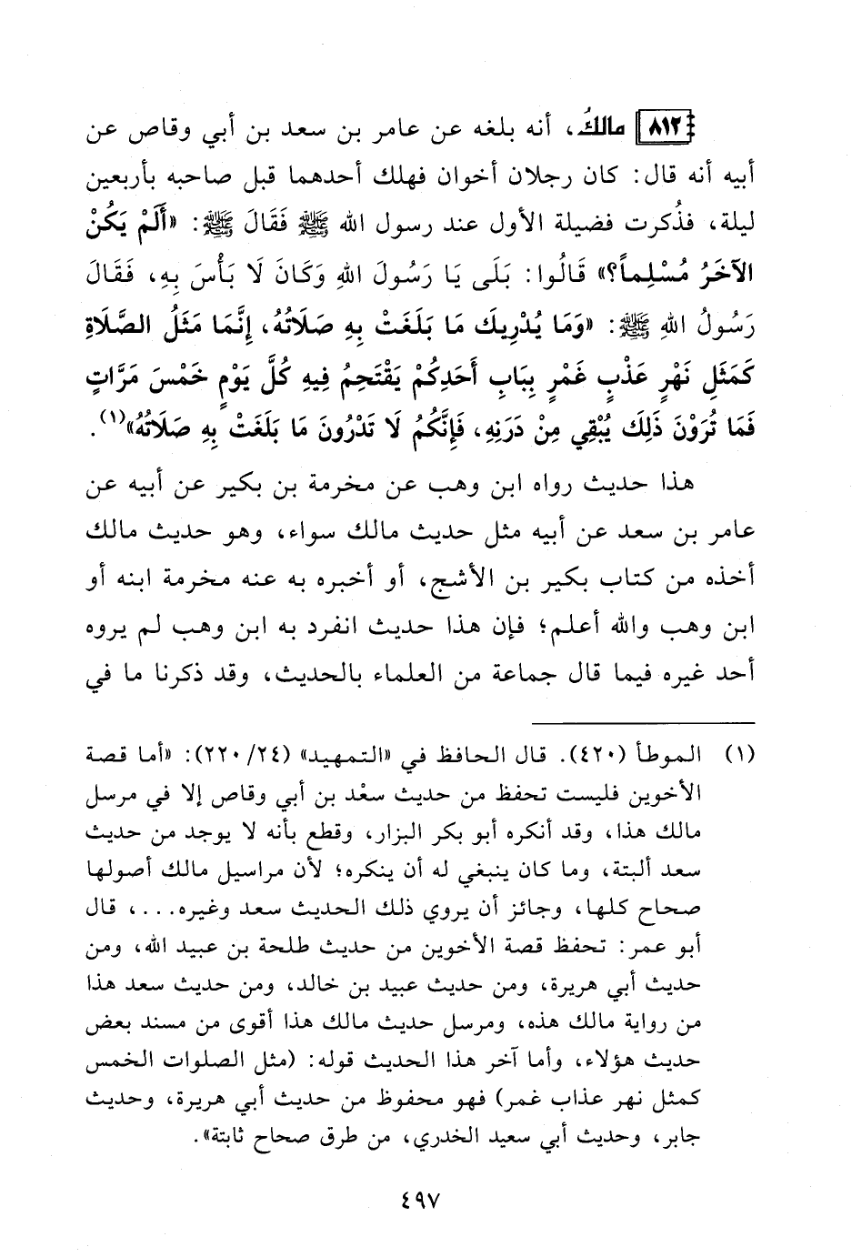 (¬1) الموطأ (420). قال الحافظ في "التمهيد" (24/ 220): "أما قصة الأخوين فليست تحفظ من حديث سعْد بن أبي وقاص إلا في مرسل مالك هذا، وقد أنكره أبو بكر البزار، وقطع بأنه لا يوجد من حديث سعد ألبتة، وما كان ينبغي له أن ينكره؛ لأن مراسيل مالك أصولها صحاح كلها، وجائز أن يروي ذلك الحديث سعد وغيره. . .، قال أبو عمر: تحفظ قصة الأخوين من حديث طلحة بن عبيد الله، ومن حديث أبي هريرة، ومن حديث عبيد بن خالد، ومن حديث سعد هذا من رواية مالك هذه، ومرسل حديث مالك هذا أقوى من مسند بعض حديث هؤلاء، وأما آخر هذا الحديث قوله: (مثل الصلوات الخمس كمثل نهر عذاب غمر) فهو محفوظ من حديث أبي هريرة، وحديث