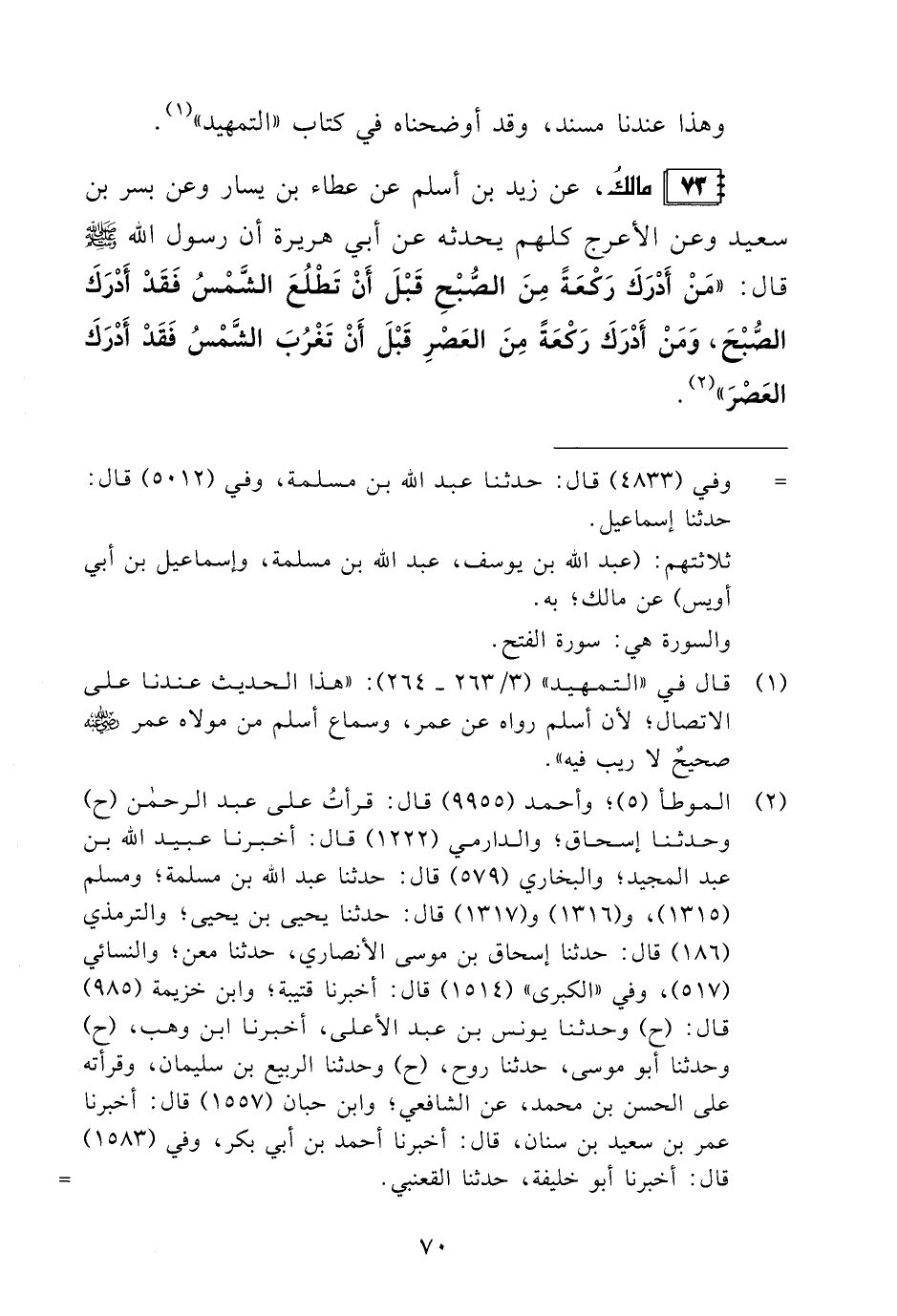73 - مالكُ، عن زيد بن أسلم عن عطاء بن يسار وعن بسر بن سعيد وعن الأعرج كلهم يحدثه عن أبي هريرة أن رسول الله - صلى الله عليه وسلم - قال: "مَنْ أَدْرَكَ رَكعَةً مِنَ الصُّبْحِ قَبْلَ أَنْ تَطْلُعَ الشَّمْسُ فَقَدْ أَدْرَكَ الصُّبْحَ، وَمَنْ أَدْرَكَ رَكعَةً مِنَ العَصْرِ قَبْلَ أَنْ تَغْرُبَ الشَّمْسُ فَقَدْ أَدْرَكَ العَصْرَ" (¬2).