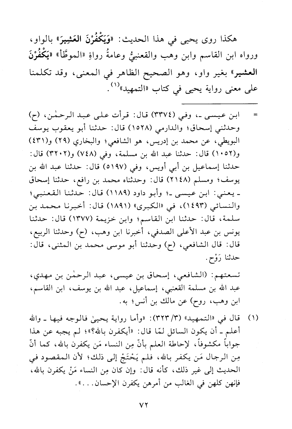 هكذا روى يحيى في هذا الحديث: "وَيَكْفُرْنَ العَشِيرَ" بالواو، ورواه ابن القاسم وابن وهب والقعنبيُّ وعامةُ رواةِ "الموطَّأ" "يَكْفُرْنَ العشير" بغير واو، وهو الصحيح الظاهر في المعنى، وقد تكلمنا على معنى رواية يحيى في كتاب "التمهيد" (¬1).