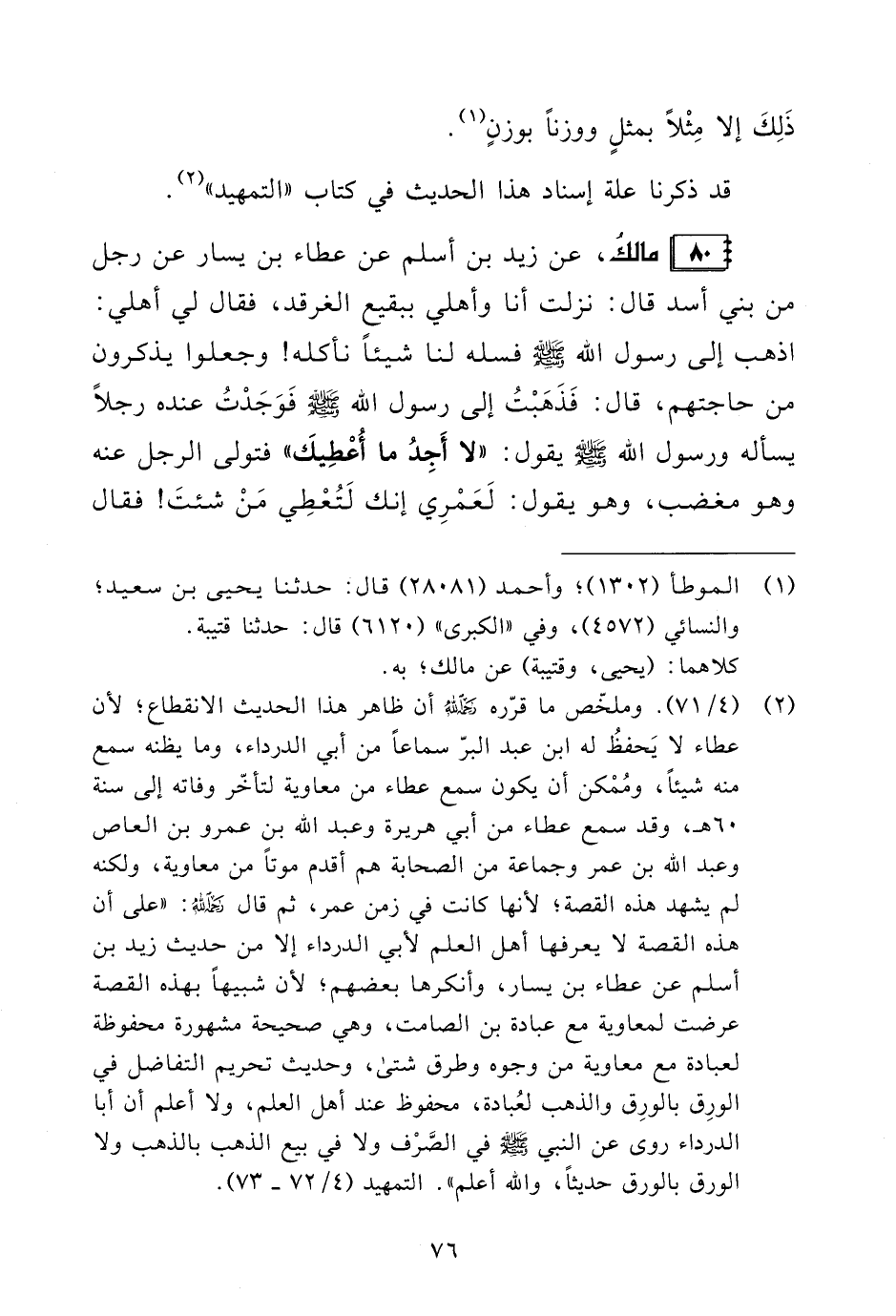 (¬2) (4/ 71). وملخّص ما قرّره -رحمه الله- أن ظاهر هذا الحديث الانقطاع؛ لأن عطاء لا يَحفظُ له ابن عبد البرّ سماعًا من أبي الدرداء، وما يظنه سمع منه شيئًا، ومُمْكن أن يكون سمع عطاء من معاوية لتأخّر وفاته إلى سنة 60 هـ، وقد سمع عطاء من أبي هريرة وعبد الله بن عمرو بن العاص وعبد الله بن عمر وجماعة من الصحابة هم أقدم موتًا من معاوية، ولكنه لم يشهد هذه القصة؛ لأنها كانت في زمن عمر، ثم قال -رحمه الله-: "على أن هذه القصة لا يعرفها أهل العلم لأبي الدرداء إلا من حديث زيد بن أسلم عن عطاء بن يسار، وأنكرها بعضهم؛ لأن شبيهًا بهذه القصة عرضت لمعاوية مع عبادة بن الصامت، وهي صحيحة مشهورة محفوظة لعبادة مع معاوية من وجوه وطرق شتى، وحديث تحريم التفاضل في الورِق بالورِق والذهب لعُبادة، محفوظ عند أهل العلم، ولا أعلم أن أبا الدرداء روى عن النبي - صلى الله عليه وسلم - في الصَّرْف ولا في بيع الذهب بالذهب ولا الورق بالورق حديثًا، والله أعلم". التمهيد (4/ 72 - 73).