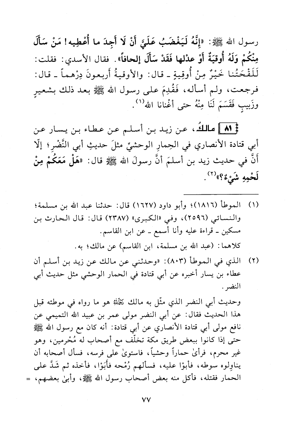 81 - مالكُ، عن زيد بن أسلم عن عطاء بن يسار عن أبي قتادة الأنصاري في الحِمارِ الوحشيِّ مثلَ حديثِ أبي النَّضْرِ؛ إلَّا أَنَّ في حديث زيد بن أسلمَ أنَّ رسولَ الله - صلى الله عليه وسلم - قال: "هَلْ مَعَكُمْ مِنْ لَحْمِهِ شَيْءٌ؟ " (¬2).
