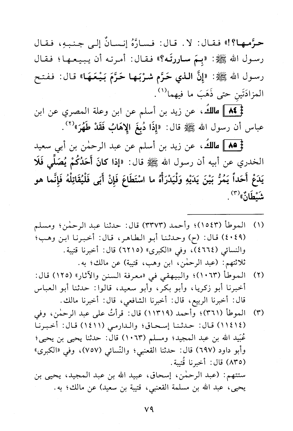 85 - مالكُ، عن زيد بن أسلم عن عبد الرحمن بن أبي سعيد الخدري عن أبيه أن رسول الله - صلى الله عليه وسلم - قال: "إذا كانَ أَحَدُكُمْ يُصَلِّي فَلَا يَدَعْ أَحَدًا يمُرُّ بَيْنَ يَدَيْهِ وَلْيَدْرَأْهُ ما اسْتَطَاعَ فَإِنْ أَبَى فَلْيُقَاتِلْهُ فَإِنَّما هو شَيْطَانٌ" (¬3).