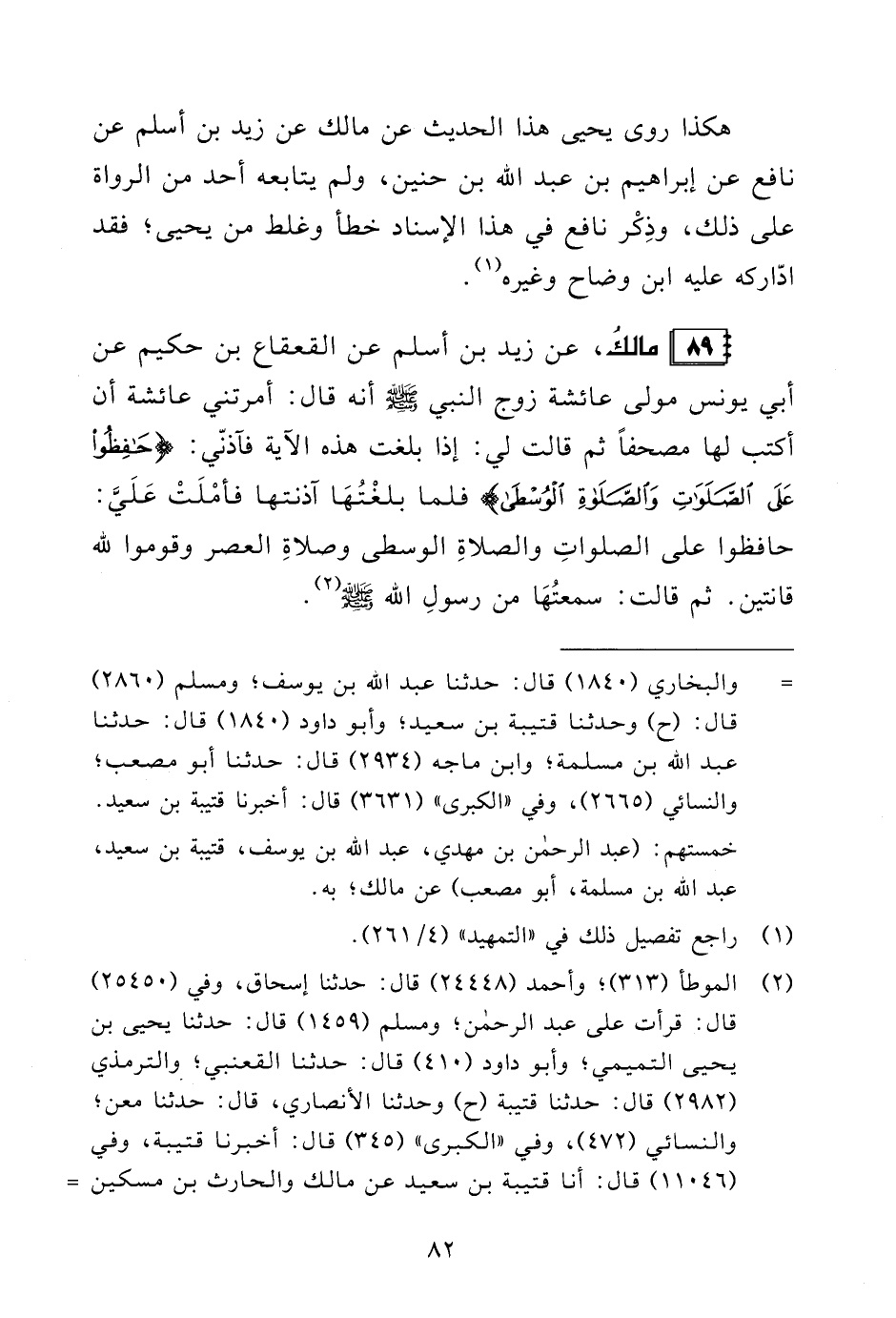 89 - مالكُ، عن زيد بن أسلم عن القعقاع بن حكيم عن أبي يونس مولى عائشة زوج النبي - صلى الله عليه وسلم - أنه قال: أمرتني عائشة أن أكتب لها مصحفًا ثم قالت لي: إذا بلغت هذه الآية فآذنّي: {حَافِظُوا عَلَى الصَّلَوَاتِ وَالصَّلَاةِ الْوُسْطَى} فلما بلغْتُهَا آذنتها فأمْلَتْ عَلَيَّ: حافظوا على الصلواتِ والصلاةِ الوسطى وصلاةِ العصر وقوموا لله قانتين. ثم قالت: سمعتُهَا من رسولِ الله - صلى الله عليه وسلم - (¬2).