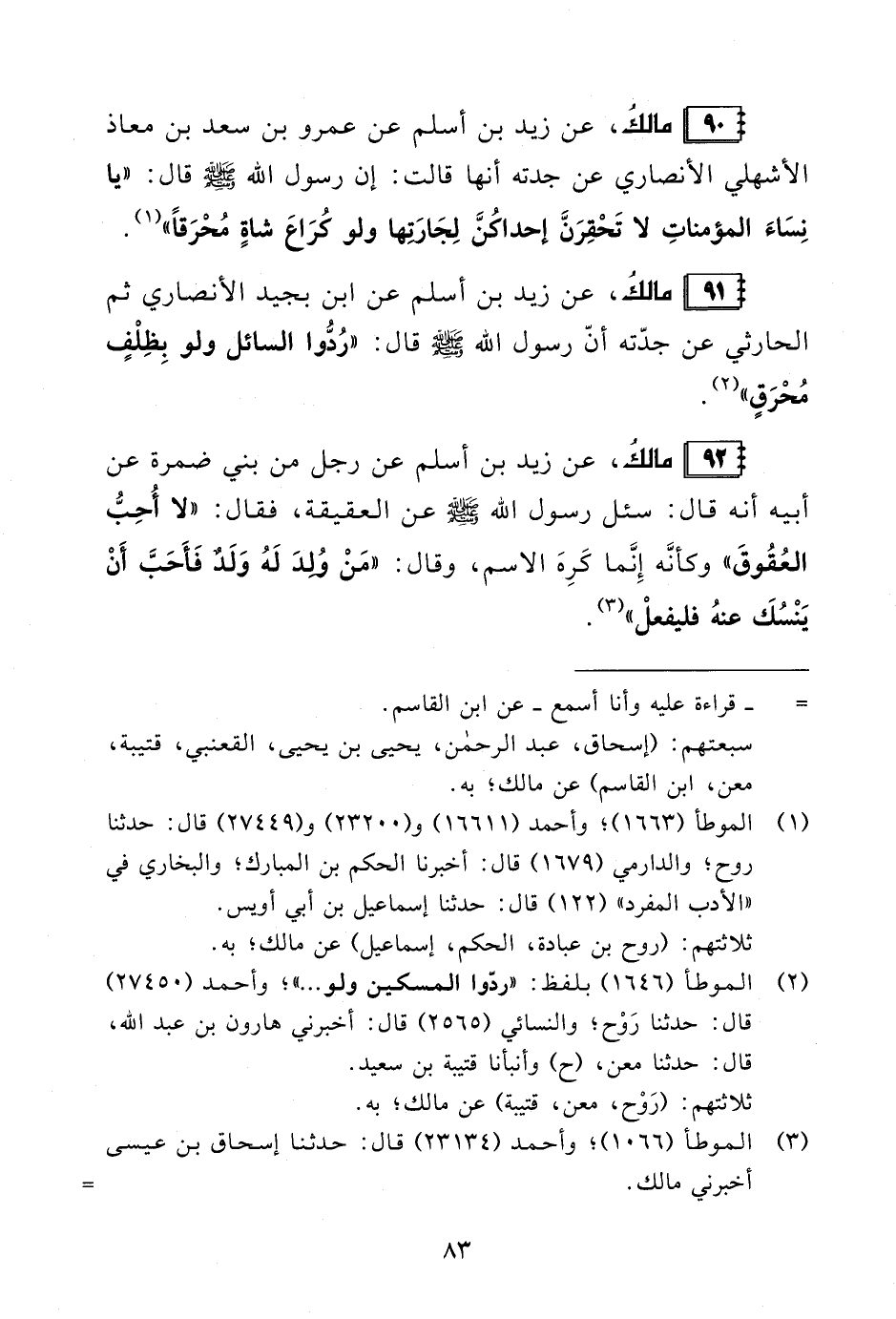 90 - مالكُ، عن زيد بن أسلم عن عمرو بن سعد بن معاذ الأشهلي الأنصاري عن جدته أنها قالت: إن رسول الله - صلى الله عليه وسلم - قال: "يا نِسَاءَ المؤمناتِ لا تَحْقِرَنَّ إحداكُنَّ لِجَارَتها ولو كُرَاعَ شاةٍ مُحْرَقًا" (¬1).