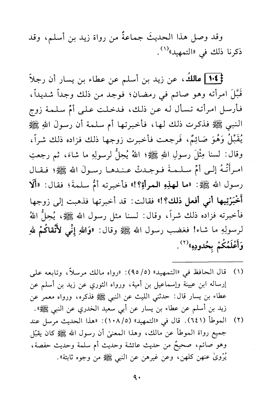104 - مالكُ، عن زيد بن أسلم عن عطاء بن يسار أن رجلًا قَبَّلَ امرأته وهو صائم في رمضان؛ فوجد من ذلك وجدًا شديدًا، فأرسل امرأته تسأل له عن ذلك، فدخلت على أمِّ سلمة زوج النبي - صلى الله عليه وسلم - فذكرت ذلك لها، فأخبرتها أم سلمة أن رسولَ اللهِ - صلى الله عليه وسلم - يُقَبِّلُ وَهُوَ صَائِمٌ، فَرجعت فأخبرت زوجها ذلك فزاده ذلك شرًا، وقال: لسنا مِثْلَ رسولِ اللهِ - صلى الله عليه وسلم -؛ اللهُ يُحِلُّ لرسولِهِ ما شاءَ، ثم رجعتِ امرأَتُهُ إلى أمِّ سلمةَ فوجدتْ عندها رسولَ الله - صلى الله عليه وسلم -؛ فقال رسول الله - صلى الله عليه وسلم -: "ما لهذِهِ المرأةِ؟ ! " فأخبرته أمُّ سلمةَ؛ فقال: "ألا أَخْبَرْتِيها أني أفعل ذلك؟ ! " فقالت: قد أخبرتها فذهبت إلى زوجها فأخبرته فزاده ذلك شرًا، وقال: لسنا مثل رسول الله - صلى الله عليه وسلم -، يُحِلُّ اللهُ لرسولِهِ ما شاء! فغضب رسول الله - صلى الله عليه وسلم - وقال: "وَاللهِ إِنِّي لأتْقاكُمْ للهِ وَأَعْلَمُكُمْ بِحُدودِهِ" (¬2).