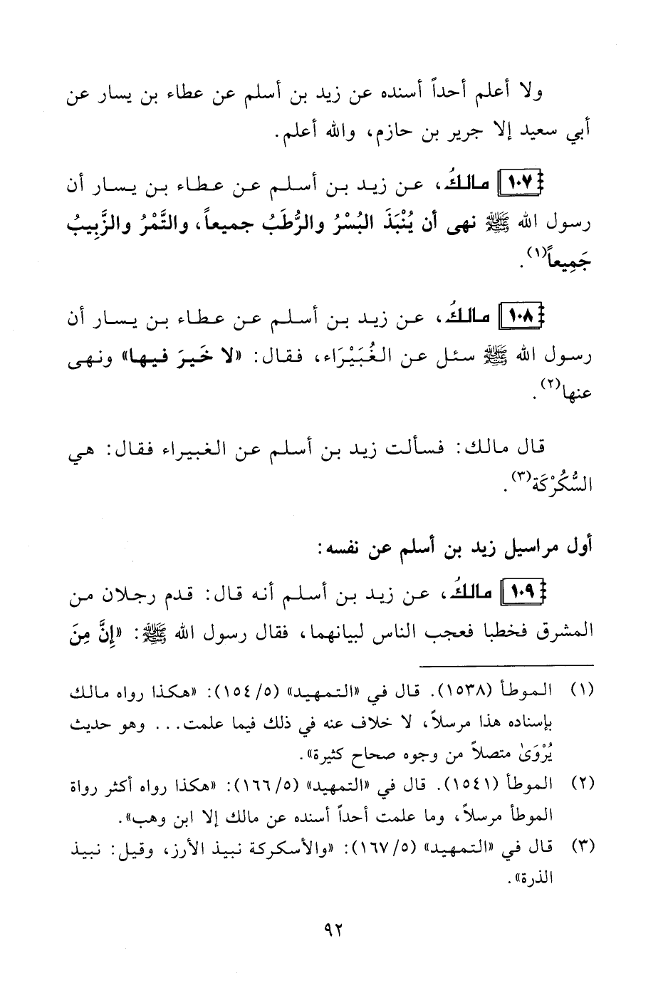 107 - مالكُ، عن زيد بن أسلم عن عطاء بن يسار أن رسول الله - صلى الله عليه وسلم - نهى أن يُنْبَذَ البُسْرُ والرُّطَبُ جميعًا، والتَّمْرُ والزَّبِيبُ جَمِيعًا (¬1).